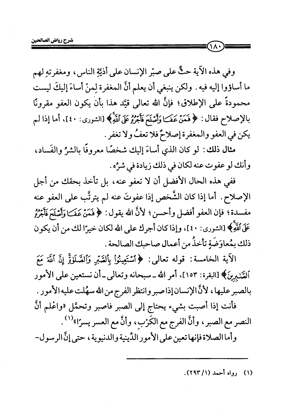 وفي هذه الآية حث على صبر الإنسان على أذية الناس، ومغفرته لهم ما أساؤوا إليه فيه. ولكن ينبغي أن يعلم أن المغفرة لمن أساء إليك ليست محمودة على الإطلاق؛ فإن الله تعالي قيد هذا بأن يكون العفو مقروناً بالإصلاح فقال: (فَمَنْ عَفَا وَأَصْلَحَ فَأَجْرُهُ عَلَى اللَّه) (الشورى: من الآية40) ، أما إذا لم يكن في العفو والمغفرة إصلاح فلا تعف ولا تغفر.