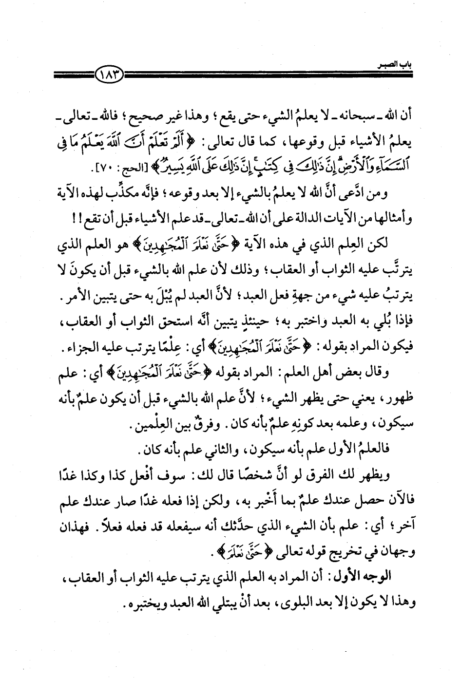 وقال بعض أهل العلم: المراد بقوله: (حَتَّى نَعْلَمَ الْمُجَاهِدِينَ) أي: علم ظهور، يعني حتى يظهر الشيء؛ لأن علم الله بالشيء قبل أن يكون علم بأنه سيكون، وعلمه بعد كونه علم بأنه كان. وفرق بين العلمين.