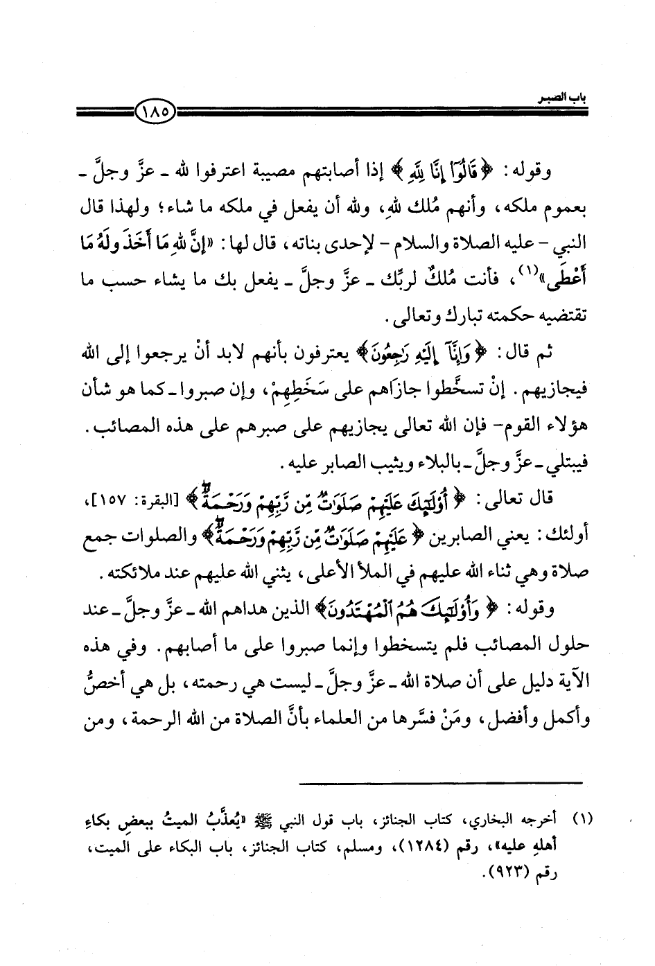 ثم قال: (وَإِنَّا إِلَيْهِ رَاجِعُونَ) يعترفون بأنهم لابد أن يرجعوا إلي الله فيجازيهم. أن تسخطوا جازاهم علي سخطهم، وإن صبروا - كما هو شأن هؤلاء القوم- فإن الله تعالي يجازيهم على صبرهم علي هذه المصائب. فيبتلي - عز وجل- بالبلاء ويثيب الصابر عليه.
