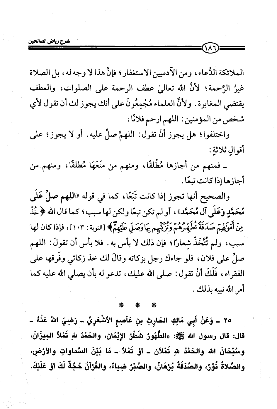 25- وعن أبي مالك الحارث بن عاصم الأشعري- رضي الله عنه- قال: قال رسول الله صلي الله عليه وسلم: ((الطهور شطر الإيمان، والحمد لله تملأ الميزان، وسبحان الله والحمد لله تملأن - أو تملأ- ما بين السماوات والأرض، والصلاة نور والصدقة برهان، والصبر ضياء، والقرآن حجة لك أو عليك.