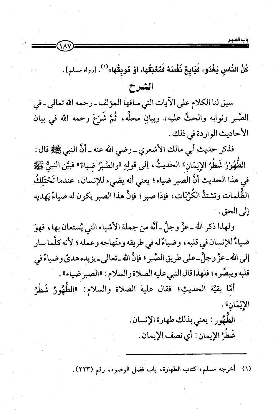 EXسبق لنا الكلام علي الآيات التي ساقها المؤلف- رحمه الله تعالي- في الصبر وثوابه والحث عليه، وبيان محله، ثم شرع رحمه الله في بيان الأحاديث الواردة في ذلك.