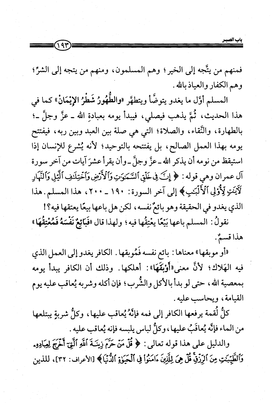 المسلم أول ما يغدو يتوضأ ويتطهر ((والطهور شطر الإيمان)) كما في هذا الحديث، ثم يذهب فيصلي، فيبدأ يومه بعبادة الله- عز وجل-؛ بالطهارة، والنقاء، والصلاة، التي هي صلة بين العبد وبين ربه، فيفتتح يومه بهذا العمل الصالح، بل يفتتحه بالتوحيد؛ لأنه يشرع للإنسان إذا استيقظ من نومه أن يذكر الله- عز وجل- وأن يقرأ عشر آيات من آخر سورة آل عمران وهي قوله:) إِنَّ فِي خَلْقِ السَّمَاوَاتِ وَالْأَرْضِ وَاخْتِلافِ اللَّيْلِ وَالنَّهَارِ لَآياتٍ لِأُولِي الْأَلْبَابِ) إلي آخر السورة: 190-200، هذا المسلم هذا الذي يغدو في الحقيقة وهو بائع نفسه، لكن هل باعها بيعاً يعتقها فيه؟!.