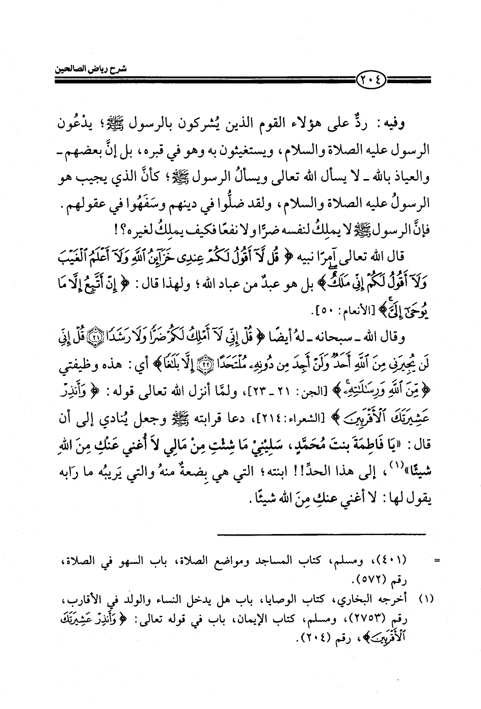 وقال الله- سبحانه- له أيضا (قُلْ إِنِّي لا أَمْلِكُ لَكُمْ ضَرّاً وَلا رَشَداً) (قُلْ إِنِّي لَنْ يُجِيرَنِي مِنَ اللَّهِ أَحَدٌ وَلَنْ أَجِدَ مِنْ دُونِهِ مُلْتَحَداً) (إِلَّا بَلاغاً) أي: هذه وظيفتي (مِنَ اللَّهِ وَرِسَالاتِهِ) (الجالنبي صلي الله عليه وسلم: من الآية21/23) ، ولما أنزل الله تعالي قوله:) وَأَنْذِرْ عَشِيرَتَكَ الْأَقْرَبِينَ) (الشعراء: 214) ، دعا قرابته صلي الله عليه وسلم وجعل ينادي إلي أن قال: ((يا فاطمة بنت محمد، سليني ما شئت من مالي لا أغني عنك من الله شيئاً)) إلي هذا الحد!! التي هي بضعة منه والتي يريبه ما رابه يقول لها: لا أغني عنك من الله شيئاً.
