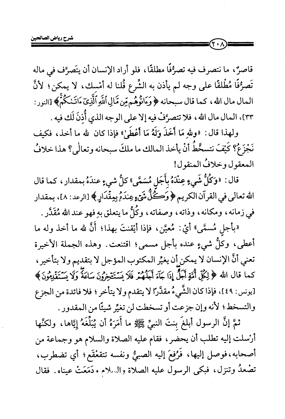 ثم إن الرسول أبلغ بنت النبي صلي الله عليه وسلم ما أمره أن يبلغه إياها، ولكنها أرسلت إليه تطلب أن يحضر، فقام عليه الصلاة والسلام هو وجماعة من أصحابه، فوصل إليها، فرفع إليه الصبي ونفسه تتقعقع؛ أي تضطرب، تصعد وتنزل، فبكي الرسول عليه الصلاة والسلام ودمعت عيناه. فقال