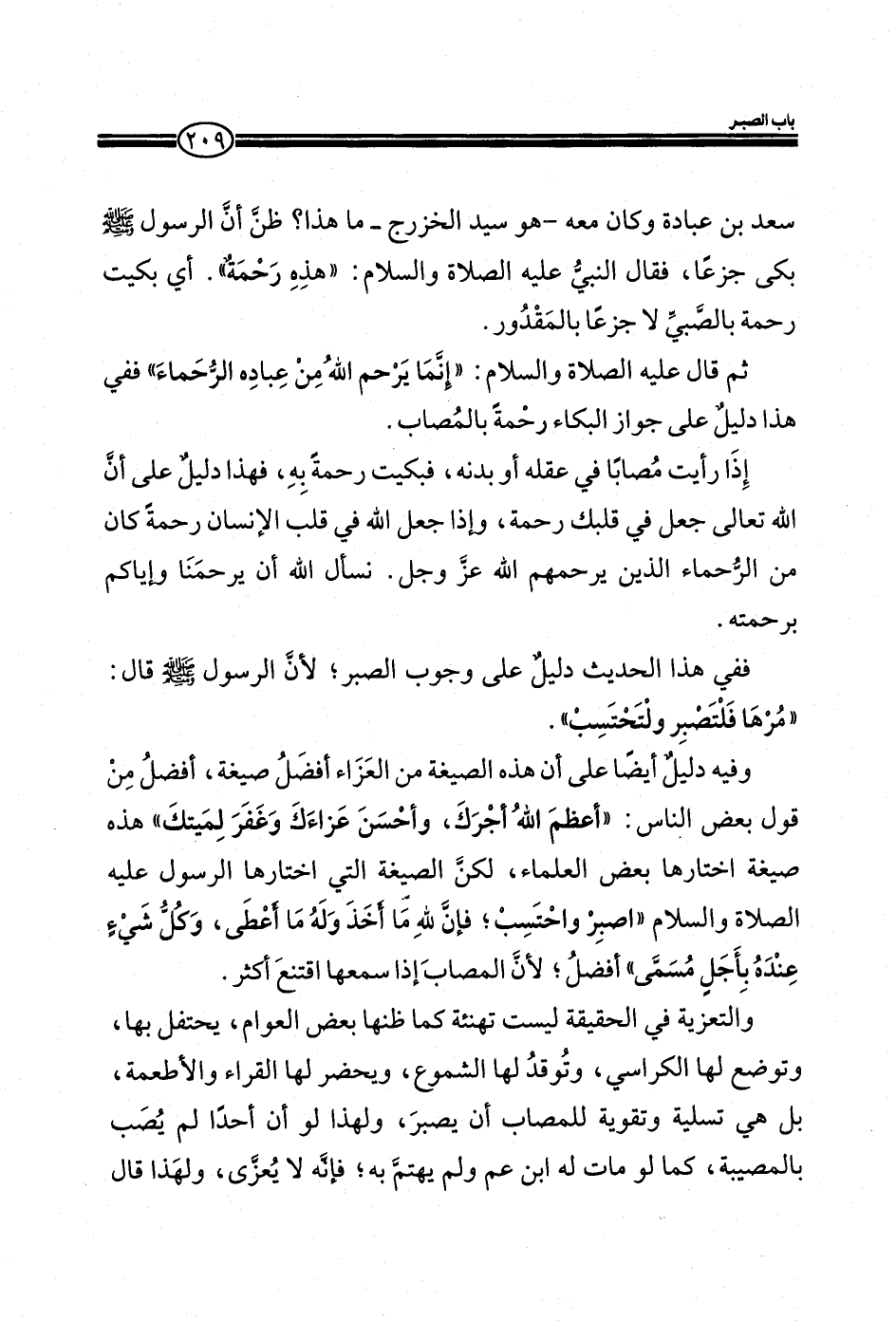 سعد بن عباده وكان معه- هو سيد الحرج- ما هذا؟ ظن أن الرسول صلي الله عليه وسلم بكي جزعاً، فقال النبي عليه الصلاة والسلام: ((هذه رحمة)) أي بكت رحمة بالصبي لا جوعاً بالمقدور.