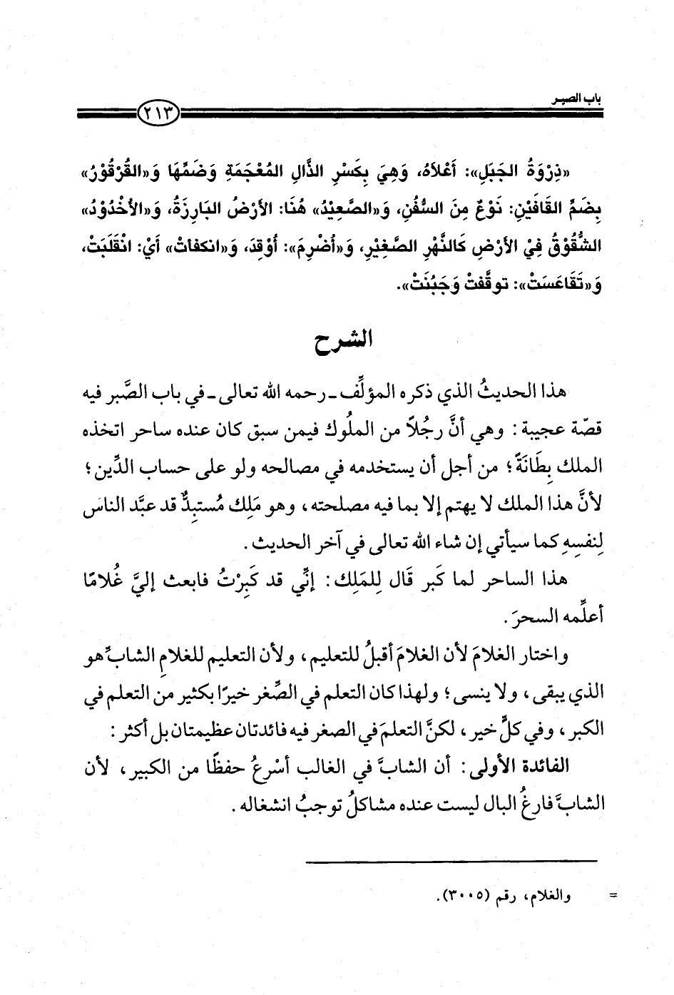 EXهذا الحديث الذي ذكره المؤلف - رحمه الله تعالي- في باب الصبر في قصة عجيبة: وهي أن رجلاً من الملوك فيمن سبق كان عنده ساحر اتخذه الملك بطانة؛ من أجل ان يستخدمه في مصالحه ولو على حساب الدين، لأن هذا الملك لا يهتم إلا بما فيه مصلحته، وهو ملك مستبد قد عبد الناس لنفسه كما سيأتي إن شاء الله تعالي في آخر الحديث.