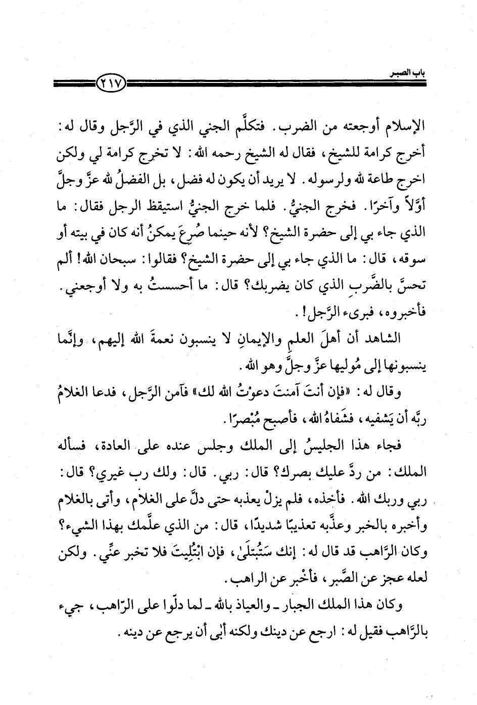 الإسلام أوجعته من الضرب. فتكلم الجني الذي في الرجل وقال له: أخرج كرامة للشيخ، فقال له الشيخ رحمه الله: لا تخرج كرامة لي ولكن أخرج طاعة لله ولرسوله. لا يريد أن يكون له فضل، بل الفضل لله عز وجل أولاً وآخرا. فخرج الجني. فلما خرج الجني استيقظ الرجل فقال: ما الذي جاء بي إلي حضرة الشيخ؟ لأنه حينما صرع يمكن أنه كان في بيته أو سوقه، قال: ما الذي جاء بي إلي حضرة الشيخ؟ فقالوا: سبحان الله! ألم تحس بالضرب الذي كان يضربك؟ قال: ما أحسست به ولا أوجعني. فأخبروه، فبريء الرجل!