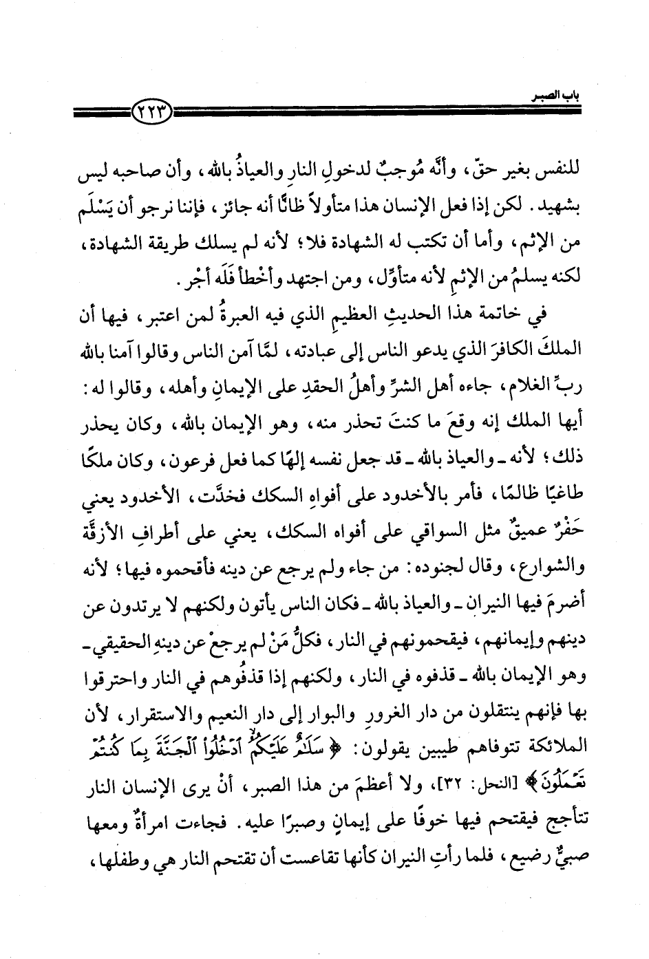 في خاتمة هذا الحديث العظيم الذي فيه العبرة لمن أعتبر، فيها أن الملك الكافر الذي يدعو الناس إلي عبادته، لما آمن الناس وقالوا آمنا بالله رب الغلام، جاءه أهل الشر وأهل الحقد على الإيمان وأهله، وقالوا له: أيها الملك إنه وقع ما كنت تحذر منه، وهو الإيمان بالله، وكان يحذر طاغياً ظالماً، فأمر بالأخدود على أفواه السكك فخدت، الأخدود يعني خفر عميق مثل السواقي على أفواه السكك، يعني على أطراف الأزقة والشوارع، وقال لجنوه: من جاء ولم يرجع عن دينه فأقحموه فيها؛ لأنه اضرم فيها النيران_ والعياذ بالله- فكان الناس يأتون ولكنهم لا يرتدون عن دينهم وإيمانهم، فيقحموهم في النار، فكل من لم يرجع عن دينه الحقيقي- وهو الإيمان بالله- قذفوه في النار، ولكنهم إذا قذفوهم في النار واحترقوا بها فإنهم ينتقلون من دار الغرور والبوار إلي دار النعيم والاستقرار، لأن الملائكة تتوفاهم طيبين يقولون:) سَلامٌ عَلَيْكُمُ ادْخُلُوا الْجَنَّةَ بِمَا كُنْتُمْ تَعْمَلُونَ) (النحل: من الآية32) ، ولا أعظم من هذا الصبر، أن يري الإنسان النار تتأجح فيقحتم فيها خوفا على إيمان وصرا عليه. فجاءت امرأة ومعها صبي رضيع، فلما رأت النيران كأنها تقاعست أن تقتحتم النار هي وطفلها،