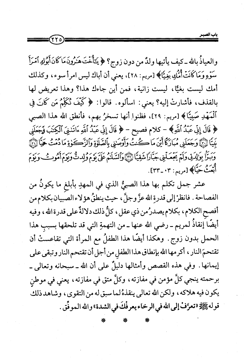 زوج؟) يَا أُخْتَ هَارُونَ مَا كَانَ أَبُوكِ امْرَأَ سَوْءٍ وَمَا كَانَتْ أُمُّكِ بَغِيّاً) (مريم: 28) ، يعني أن أبك ليس امرأ سوء، وكذلك أمك ليست بغياً، ليست بزانية، فمن آبين جاءك هذا؟ وهذا تعريض لها بالقذف، فأشارت إليه؟ يعني: اسألوه قالوا:) كَيْفَ نُكَلِّمُ مَنْ كَانَ فِي الْمَهْدِ صَبِيّاً) (مريم: من الآية29) فظنوا أنها تسخر بهم، فأنطق الله هذا الصبي) قَالَ إِنِّي عَبْدُ اللَّهِ) - كلام صحيح-) قَالَ إِنِّي عَبْدُ اللَّهِ آتَانِيَ الْكِتَابَ وَجَعَلَنِي نَبِيّاً)) وَجَعَلَنِي مُبَارَكاً أَيْنَ مَا كُنْتُ وَأَوْصَانِي بِالصَّلاةِ وَالزَّكَاةِ مَا دُمْتُ حَيّاً) (وَبَرّاً بِوَالِدَتِي وَلَمْ يَجْعَلْنِي جَبَّاراً شَقِيّاً) وَالسَّلامُ عَلَيَّ يَوْمَ وُلِدْتُ وَيَوْمَ أَمُوتُ وَيَوْمَ أُبْعَثُ حَيّاً) (مريم: 30-33) .