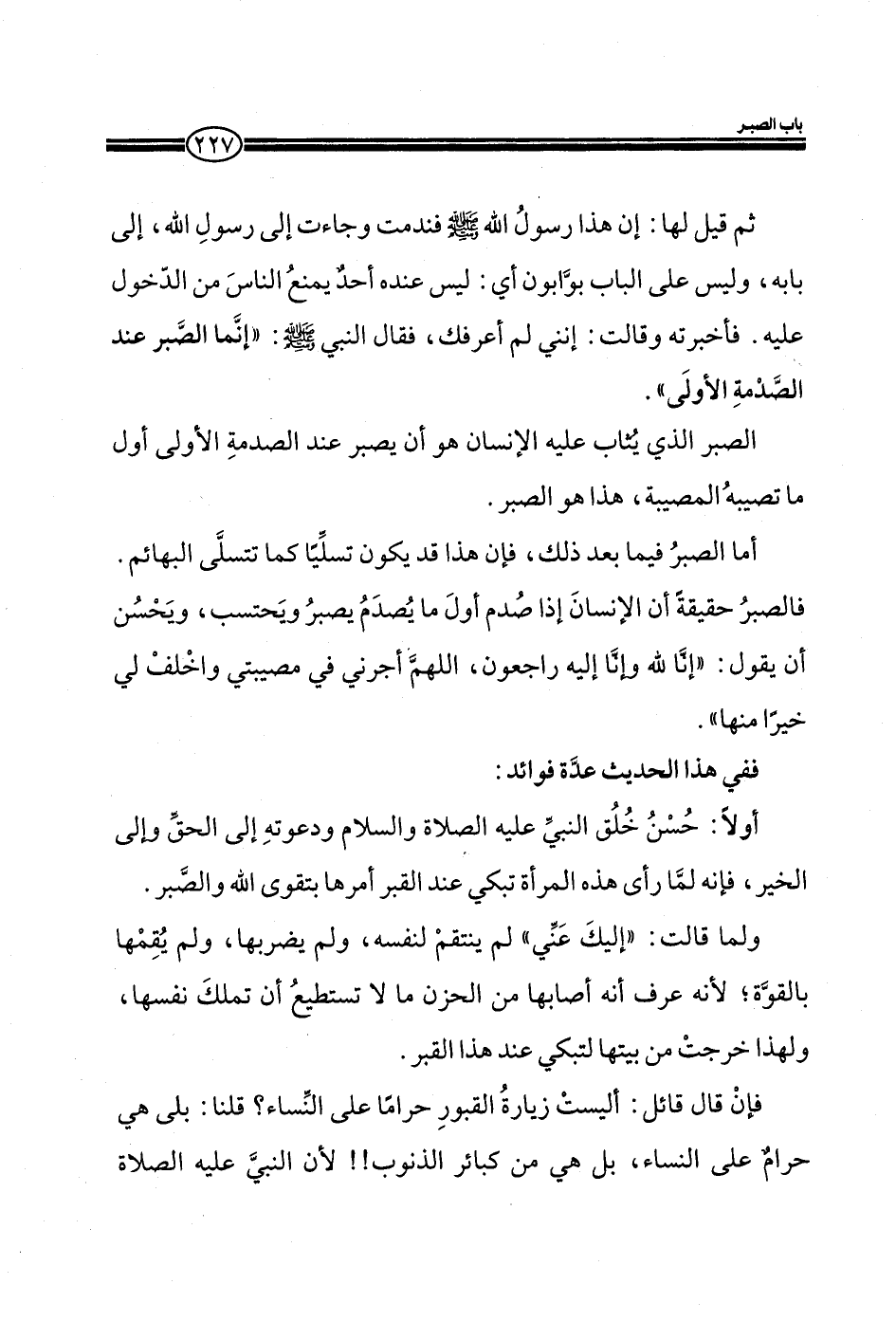 ثم قيل لها: إن هذا رسول الله صلي الله عليه وسلم فندمت وجاءت إلي رسول الله، إلي بابه، وليس على الباب بوابون أي: ليس عنده أحد يمنع الناس من الدخول عليه. فأخبرته وقالت: إنني لم أعرفك، فقال النبي صلي الله عليه وسلم: ((إنما الصبر عند الصدمة الأولي)) .