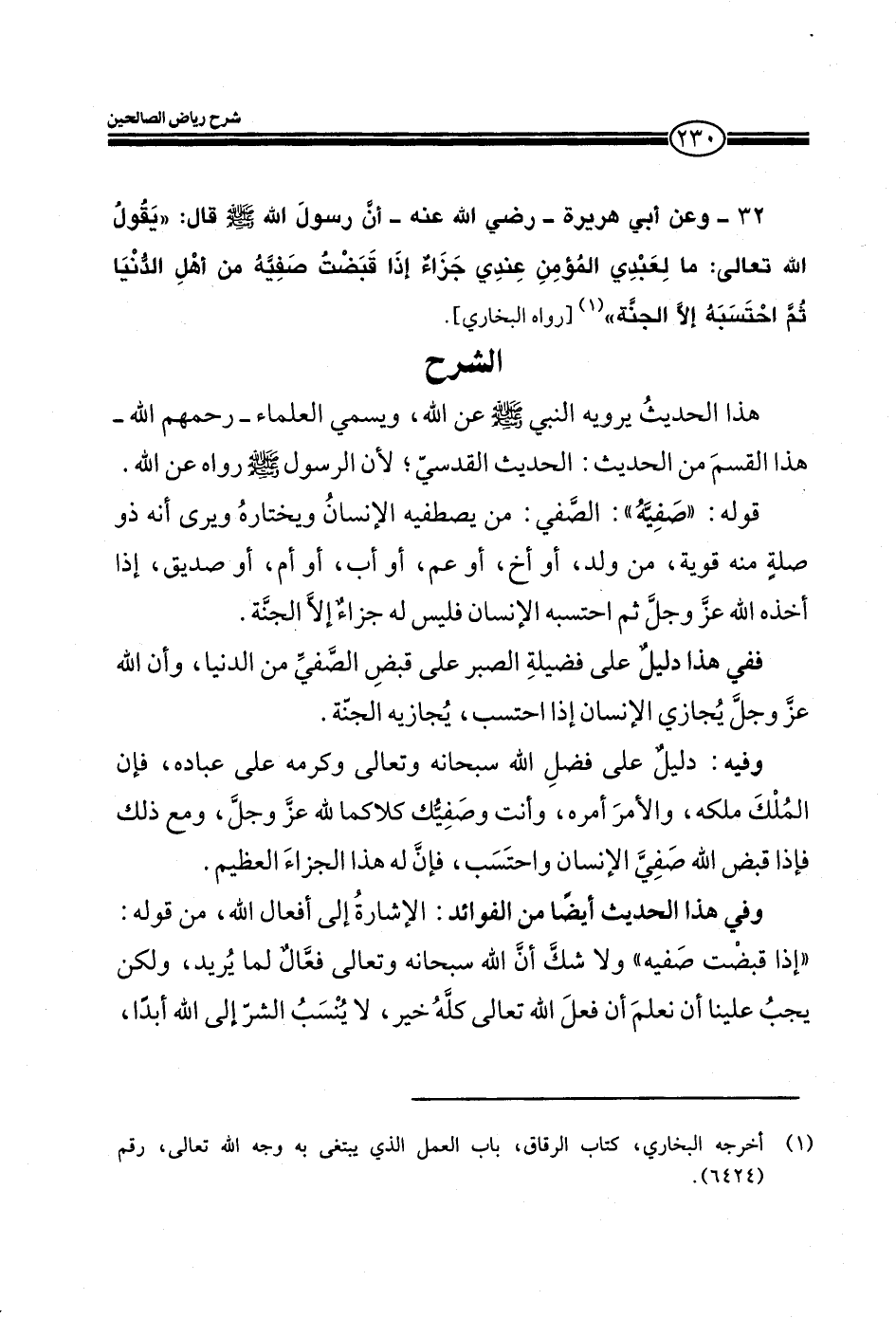 32- وعن أبي هريرة- رضي الله عنه- أن رسول الله صلي الله عليه وسلم: ((يقول الله تعالي: ما لعبدي المؤمن عندي جزاء إذا قبضت صفيه من أهل الدنيا ثم احتسبه إلا الجنة)) (رواه البخاري) .