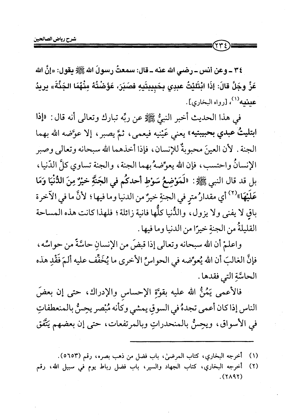 34- وعن أنس- رضي الله عنه- قال: سمعت رسول الله صلي الله عليه وسلم يقول: ((إن الله عز وجل قال: إذا ابتليت عبدي بحبيبتيه فصبر، عوضته منها الجنة) 9 يريد عينيه (رواه البخاري) .