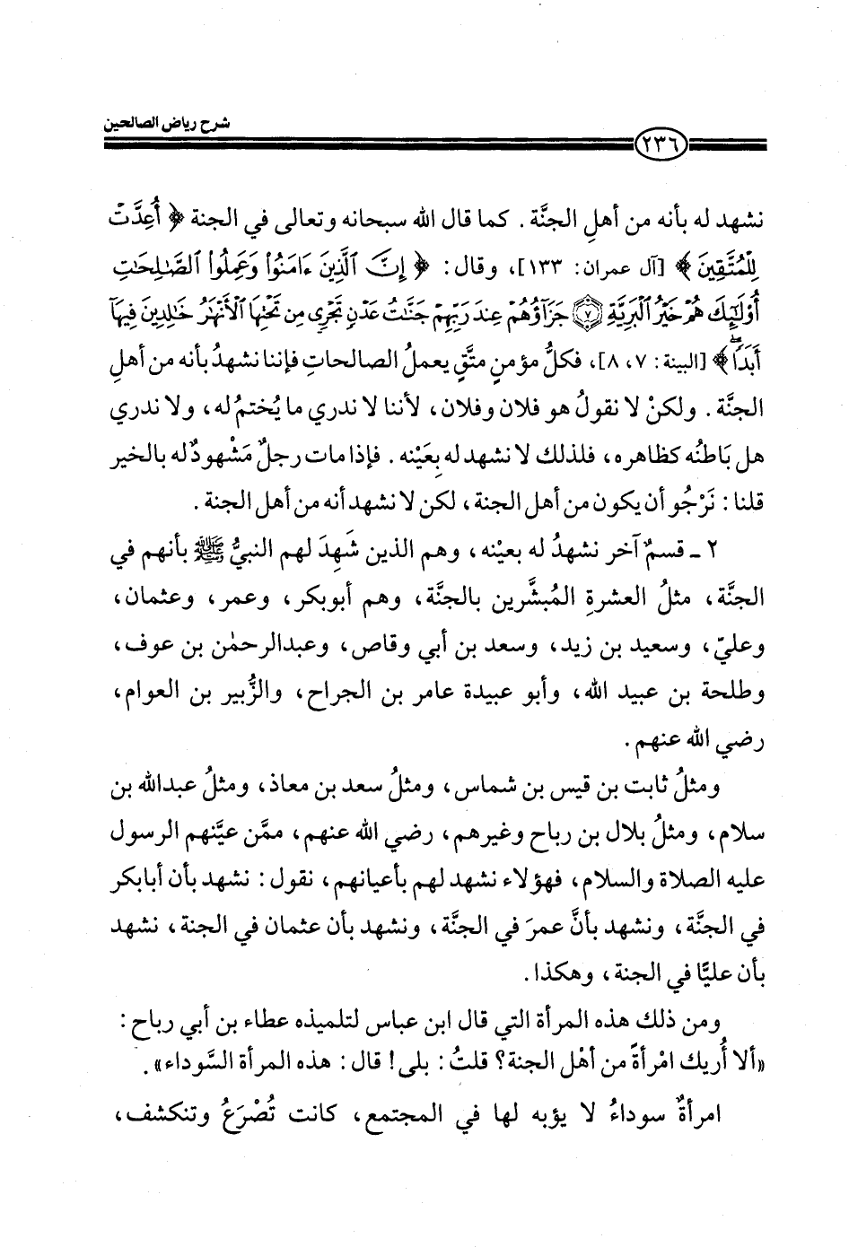 ومثل ثابت بن قيس بن شماس، ومثل سعد بن معاذ، ومثل عبد الله بن سلام، ومثل بلال بن رباح، وغيرهم، رضي الله عنهم، ممن عينهم الرسول عليه الصلاة والسلام، فهؤلاء نشهد لهم بأعيانهم، نقول: نشهد بأن أبا بكر في الجنة، ونشهد بأن عمر في الجنة، ونشهد بأن عثمان في الجنة، نشهد بأن عليا في الجنة، وهكذا.