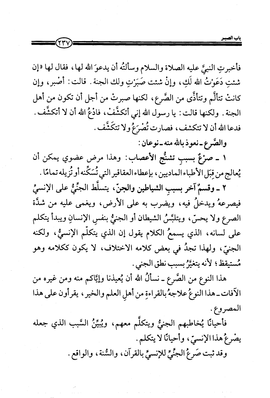 فأخبرت النبي عليه الصلاة والسلام وسألته أن يدعو اله لها، فقال لها ((إن شئت دعوت الله لك، وإن شئت صبرت ولك الجنة، قالت: اصبر، وإن كانت تتألم وتتأذي من الصرع، لكنها صبرت من أجل أن تكون من أهل الجنة. ولكنها قالت: يا رسول الله إني أتكشف، فأدع الله أن لا أتكشف. فدعا الله أن لا تتكشف، فصارت تصرع ولا تتكشف.