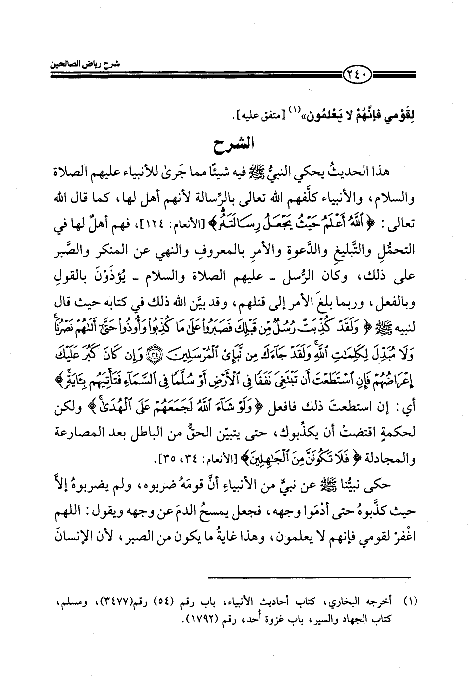 EXهذا الحديث يحكي النبي صلي الله عليه وسلم فيه شيئا مما جري للأنبياء عليهم الصلاة والسلام، والأنبياء كلفهم الله تعالي بالرسالة لأنهم اصل لها، كما قال الله تعالي:) اللَّهُ أَعْلَمُ حَيْثُ يَجْعَلُ رِسَالَتَهُ) (الأنعام: من الآية124) ، فهم أهل لها في التحمل والتبليغ والدعوة والأمر بالمعروف والنهي عن المنكر والصبر علي ذلك، وكان الرسل - عليهم الصلاة والسلام- يؤذنون بالقول وبالفعل، وربما بلغ الأمر إلي قتلهم، وقد بين الله ذلك في كتابه حيث قال لنبيه صلي الله عليه وسلم:) وَلَقَدْ كُذِّبَتْ رُسُلٌ مِنْ قَبْلِكَ فَصَبَرُوا عَلَى مَا كُذِّبُوا وَأُوذُوا حَتَّى أَتَاهُمْ نَصْرُنَا وَلا مُبَدِّلَ لِكَلِمَاتِ اللَّهِ وَلَقَدْ جَاءَكَ مِنْ نَبَأِ الْمُرْسَلِينَ) (اسْتَطَعْتَ أَنْ تَبْتَغِيَ نَفَقاً فِي الْأَرْضِ أَوْ سُلَّماً فِي السَّمَاءِ فَتَأْتِيَهُمْ بِآيَةٍ) أي: إن استطعت ذلك فافعل (وَلَوْ شَاءَ اللَّهُ لَجَمَعَهُمْ عَلَى الْهُدَى) ولكن لحكمة اقتضت أن يكذبوك، حتى يتبن الحق من الباطل بعد المصارعة والمجادلة) ى فَلا تَكُونَنَّ مِنَ الْجَاهِلِينَ) (الأنعام: من الآية35) .