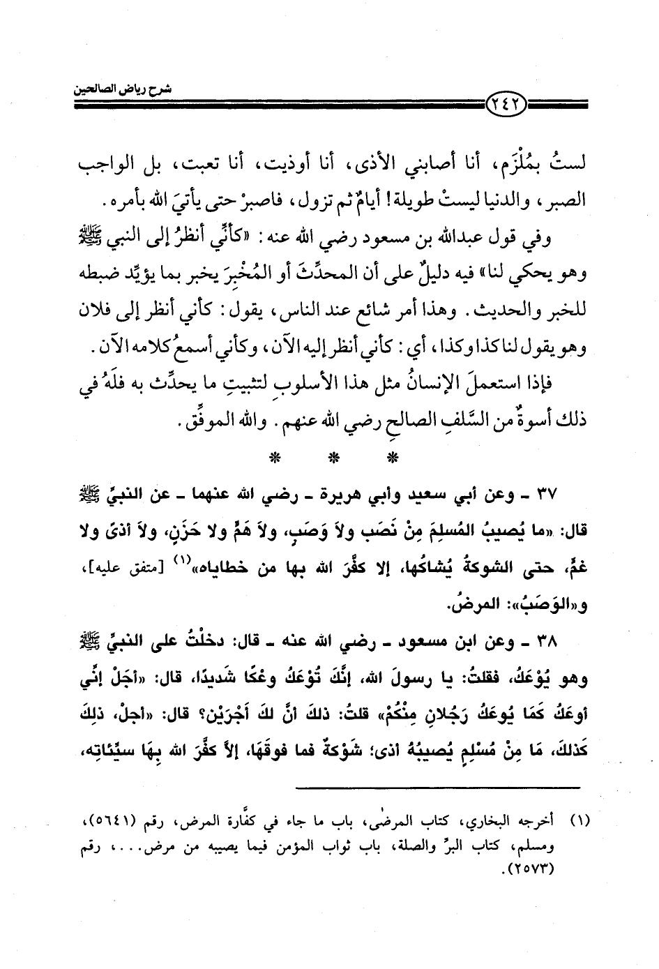 37- وعن أبي سعيد وابي هريرة- رضي الله عنهما- عن النبي صلي الله عليه وسلم قال: ((ما يصيب المسلم من نصب ولا صب، ولا هم ولا حزن، ولا أذى ولا غم، حتى الشوكة يشاكها، إلا كفر الله بها من خطاياه)) (متفق عليه) ، ((والوصب)) المرض