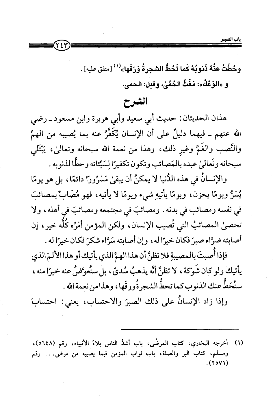EXهذان الحديثان: حديث أبي سعيد وأبي هريرة وابن مسعود - رضي الله عنهم- فيهما دليل علي أن الإنسان يكفر عنه بما يصيبه من الهم والنصب والغم وغير ذلك، وهذا من نعمة الله سبحانه وتعالي، يبتلي سبحانه وتعالي عبده بالمصائب وتكون تكفيراً لسيئاته وحطا لذنوبه.