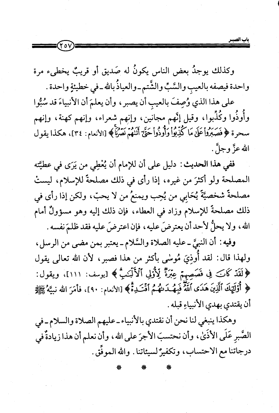 وفيه: أن النبي ـ عليه الصلاة والسلام ـ يعتبر بمن مضى من الرسل، ولهذا قال: لقد أوذي موسى بأكثر من هذا فصبر، لأن الله تعالي يقول) لَقَدْ كَانَ فِي قَصَصِهِمْ عِبْرَةٌ لِأُولِي الْأَلْبَاب) (يوسف: من الآية111) ويقول (أُولَئِكَ الَّذِينَ هَدَى اللَّهُ فَبِهُدَاهُمُ اقْتَدِه) (الأنعام: 90) ، فأمر الله نبيه صلى الله عليه وسلم أن يقتدي بهدي الأنبياء قبله.