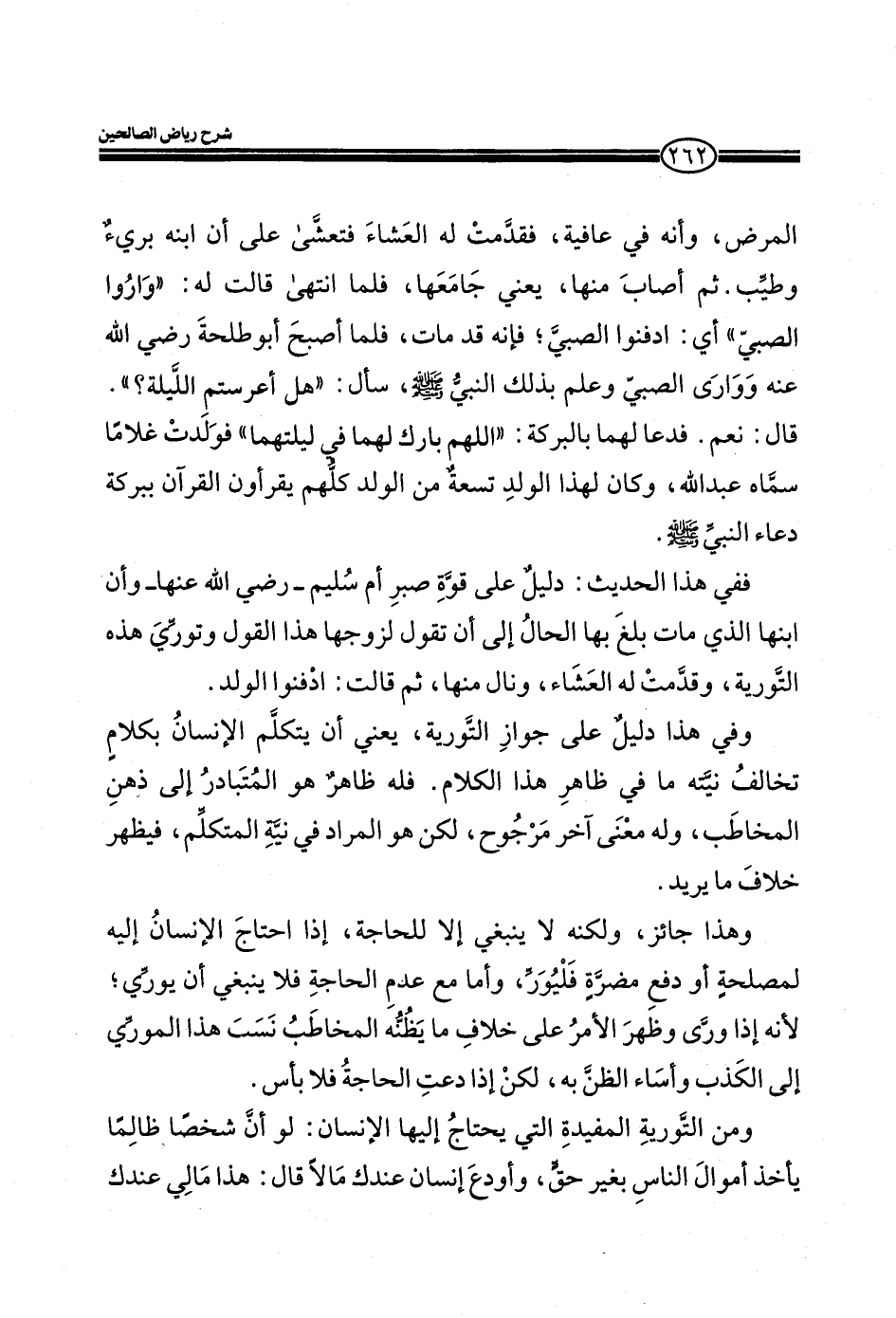 وفي هذا دليل على جواز التورية، يعني أن يتكلم الإنسان بكلام تخالف نيته ما في ظاهرة هذا الكلام. فله ظاهر هو المتبادر إلى ذهن المخاطب، وله معنى آخر مرجوح، لكن هو المراد في نية المتكلم، فيظهر خلاف ما يريد.