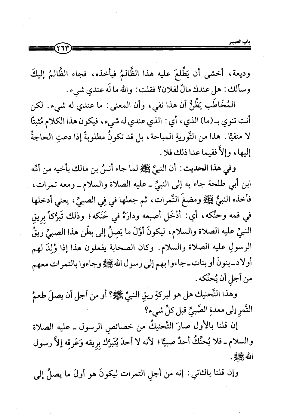 وفي هذا الحديث: أن النبي صلي الله عليه وسلم لما جاء أنس بن مالك بأخيه من أمه ابن أبي طلحة جاء به إلى النبي ـ عليه الصلاة والسلام ـ ومعه تمرات، فأخذه النبي صلي الله عليه وسلم ومضغ التمرات، ثم جعلها في في الصبي، يعني أدخلها فمه وحنكه، أي: أدخل أصبعه وداره في حنكه؛ وذلك تبركا بريق النبي عليه الصلاة والسلام، ليكون أول ما يصل إلى بطن الصبي ريق الرسول عليه الصلاة والسلام. وكان الصحابة يفعلون هذا إذا ولد لهم أولاد ـ بنون أو بنات ـ جاءوا بهم إلى رسول الله صلى الله عليه وسلم وجاءوا بالتمرات معهم من أجل أن يحنكه.