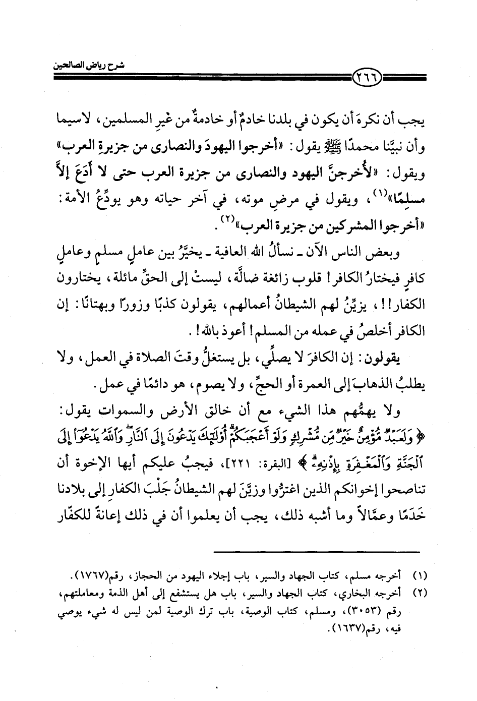 يجب أن نكره أن يكون في بلدنا خادم أو خادمة من غير المسلمين، ولا سيما وأن نبينا محمدا صلى الله عليه وسلم يقول ((أخرجوا اليهود والنصارى من جزيرة العرب)) ويقول: ((لأخرجن اليهود والنصارى من جزيرة العرب حتى لا أدع إلا مسلما)) ، ويقول في مرض موته، في آخر حياته وهو يودع الأمة: ((أخرجوا المشركين من جزيرة العرب)) .