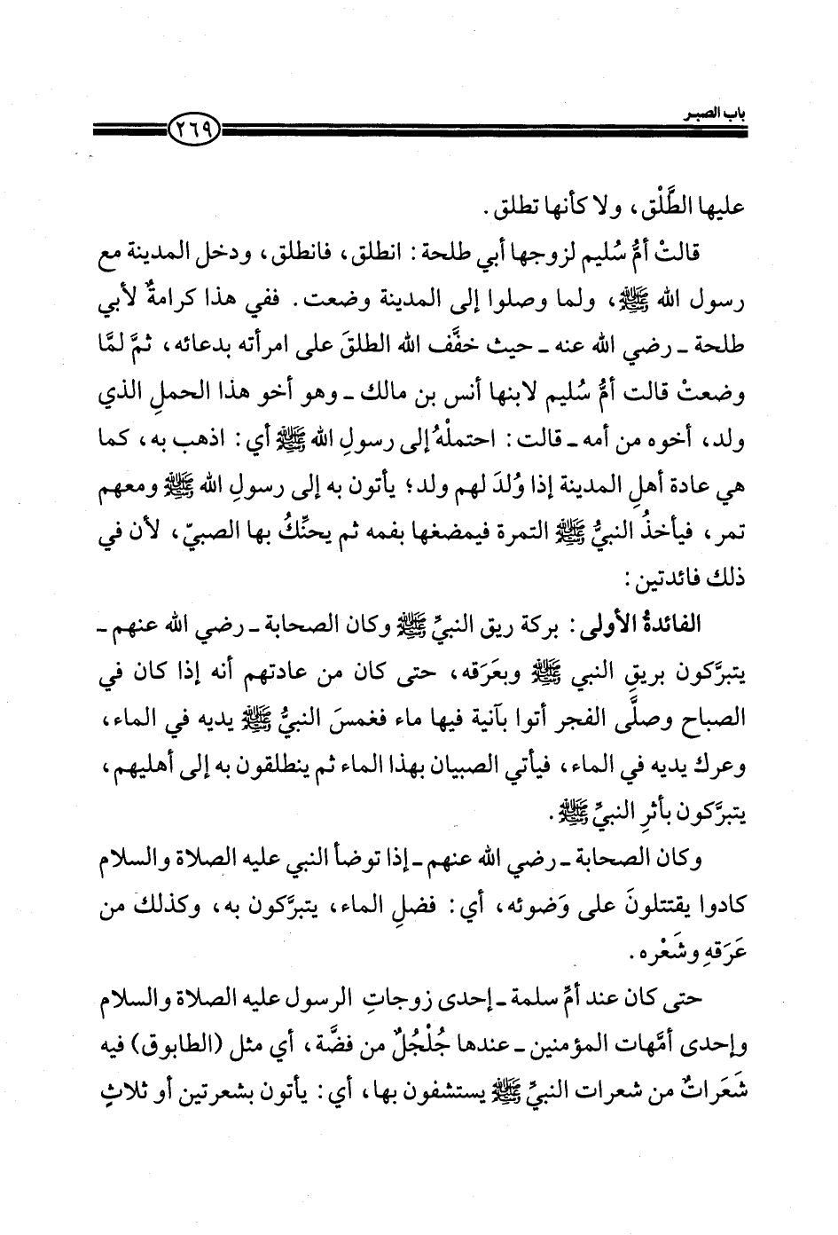قالت أم سليم لزوجها أبي طلحة: انطلق، فانطلق، ودخل المدينة مع رسول الله صلى الله عليه وسلم، ولما وصلوا إلى المدينة وضعت. ففي هذا كرامة لأبي طلحة ـ رضي الله عنه ـ حيث خفف الله الطلق على امرأته بدعائه، ثم لما وضعت قالت أم سليم لابنها أنس بن مالك ـ وهو أخو هذا الحمل الذي ولد، أخوه من أمه ـ قالت: احتمله إلى رسول الله صلى الله عليه وسلم ومعهم نمر، فيأخذ النبي صلي الله عليه وسلم التمرة فيمضغها بفمه ثم يحنك بها الصبي، لأن في ذلك فائدتين: