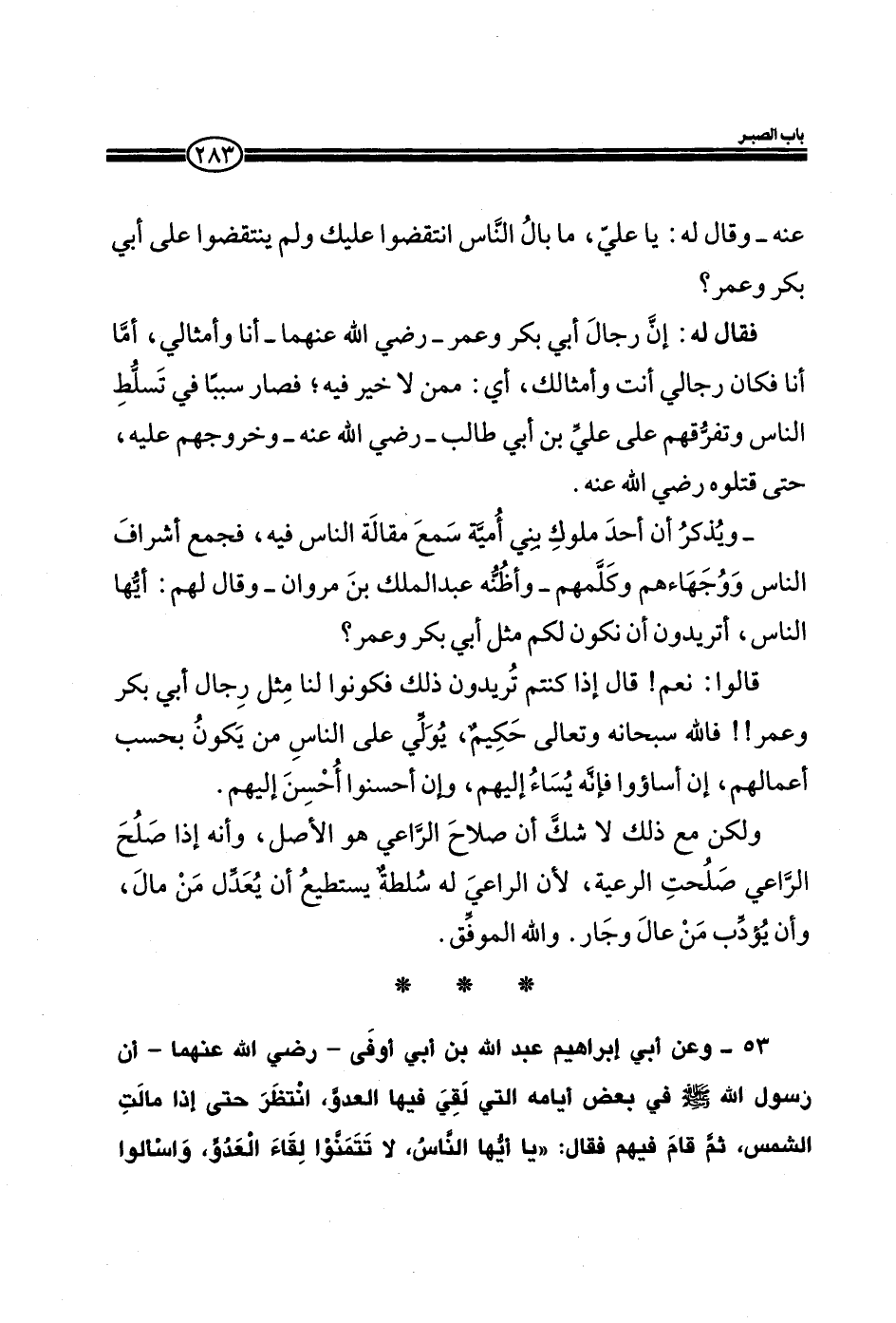 53 ـ وعن أبي إبراهيم عبد الله بن أبي أوفى ـ رضي الله عنهما ـ أن رسول الله صلى الله عليه وسلم في بعض أيامه التي لقي فيها العدو، انتظر حتى مالت الشمس، ثم قام فيهم فقال: ((يا أيها الناس، لا تتمنوا لقاء العدو، واسألوا