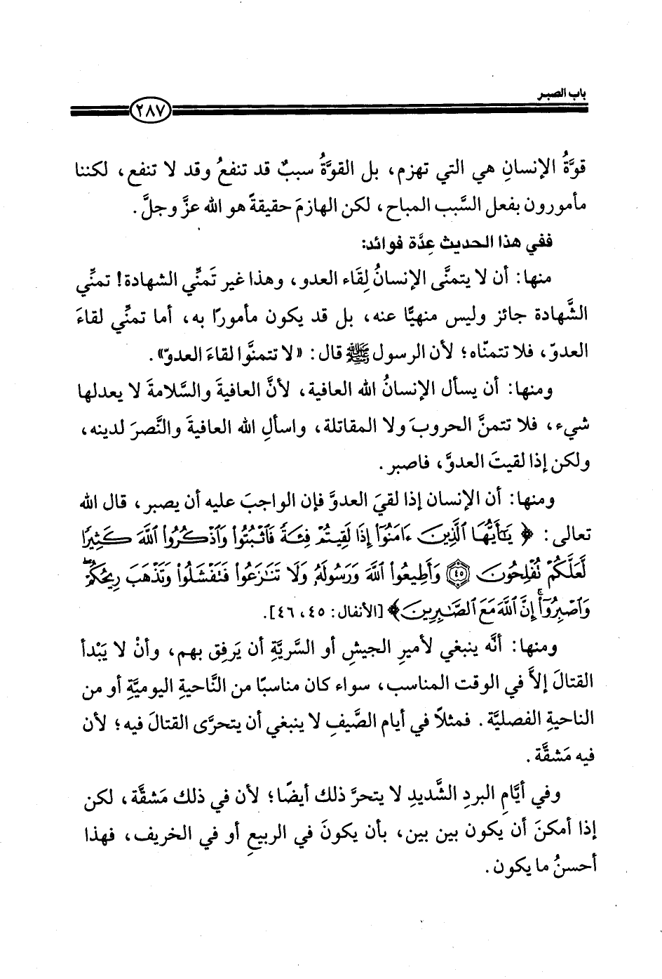ومنها: أن الإنسان إذا لقي العدو فإن الواجب عليه أن يصبر، قال الله تعالي:) يَا أَيُّهَا الَّذِينَ آمَنُوا إِذَا لَقِيتُمْ فِئَةً فَاثْبُتُوا وَاذْكُرُوا اللَّهَ كَثِيراً لَعَلَّكُمْ تُفْلِحُونَ) (وَأَطِيعُوا اللَّهَ وَرَسُولَهُ وَلا تَنَازَعُوا فَتَفْشَلُوا وَتَذْهَبَ رِيحُكُمْ وَاصْبِرُوا إِنَّ اللَّهَ مَعَ الصَّابِرِينَ) (لأنفال: 45/46) .