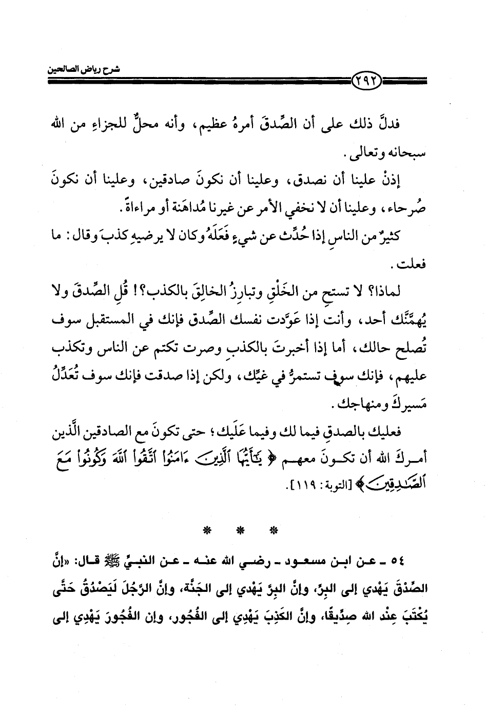 54 ـ عن ابن مسعود ـ رضي الله عنه ـ عن النبي صلي الله عليه وسلم قال: ((إن الصدق يهدي إلى البر، وإن البر يهدي إلى الجنة، وإن الرجل ليصدق حتى يكتب عند الله صديقا، وإن الكذب يهدي إلى الفجور، وإن الفجور يهدي إلى