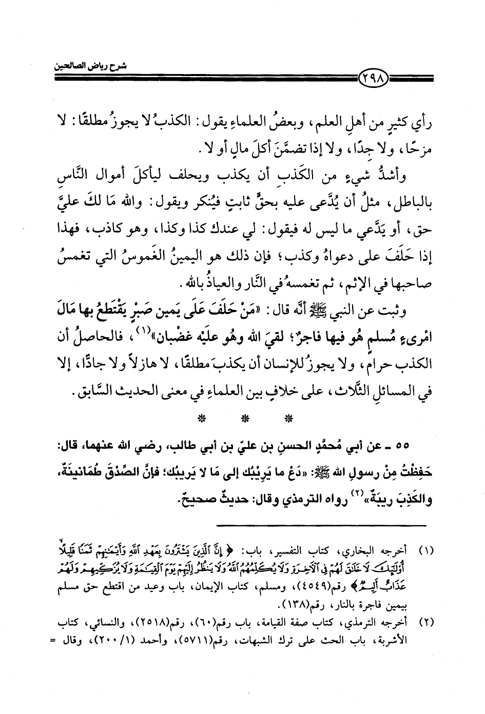 55 ـ عن أبي محمد الحسن بن على بن أبي طالب، رضي الله عنهما، قال: حفظت من رسول الله صلى الله عليه وسلم: ((دع ما يريبك إلى ما لا يريبك؛ فإن الصدق طمأنينة، والكذب ريبة)) رواه الترمذي وقال: حديث صحيح.