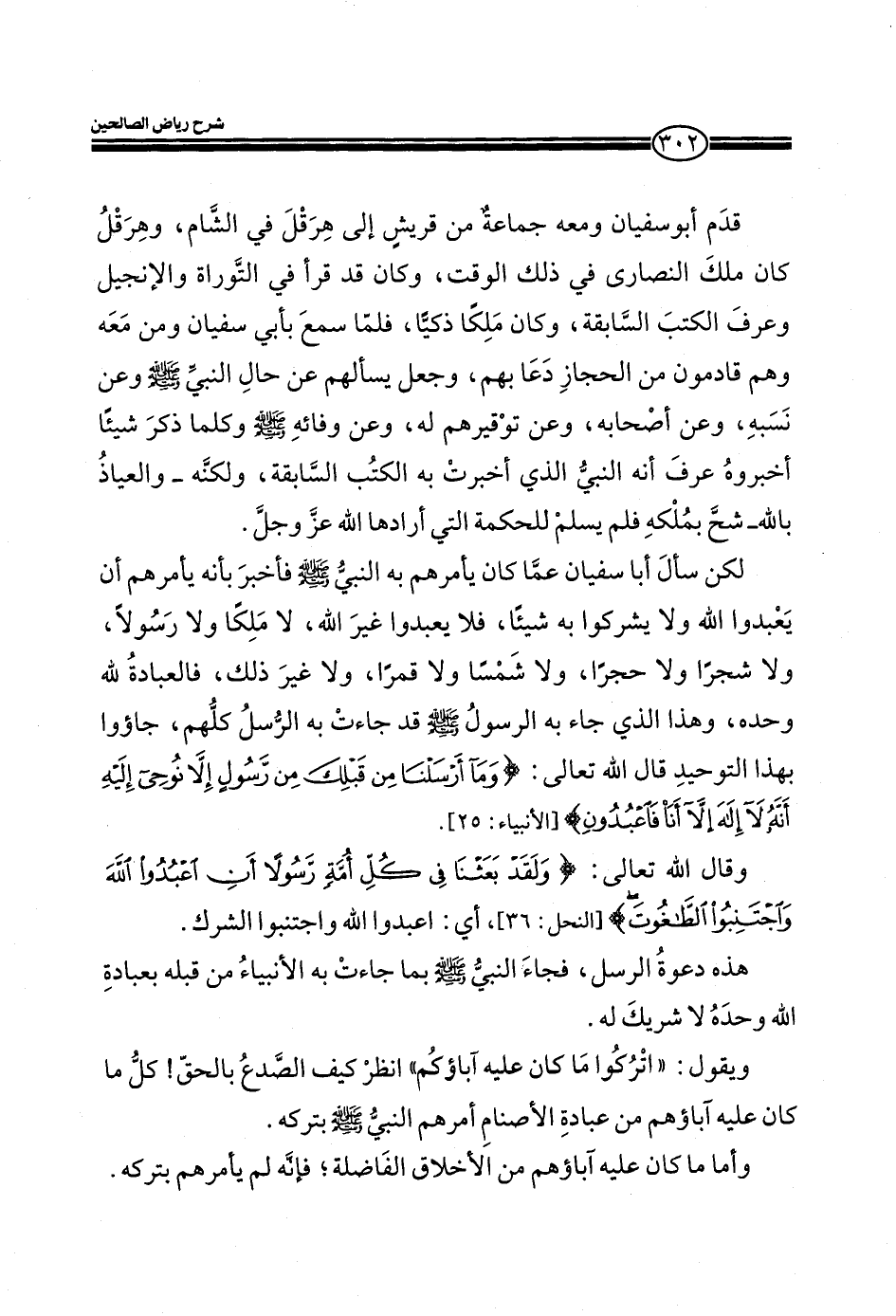 لكن سأل أبا سفيان عما كان يأمرهم به النبي صلي الله عليه وسلم فأخبره بأنه يأمرهم أن يعبدوا الله ولا يشركوا به شيئا، فلا يعبدوا غير الله، لا ملكا ولا رسولا، ولا شجرا ولا حجرا، ولا شمسا ولا قمرا، ولا غير ذلك، فالعباد ة لله وحده، وهذا الذي جاء به الرسول صلى الله عليه وسلم قد جاءت به الرسل كلهم، جاؤوا بهذا التوحيد قال الله تعالى: (وَمَا أَرْسَلْنَا مِنْ قَبْلِكَ مِنْ رَسُولٍ إِلَّا نُوحِي إِلَيْهِ أَنَّهُ لا إِلَهَ إِلَّا أَنَا فَاعْبُدُونِ) (الانبياء: 25) .