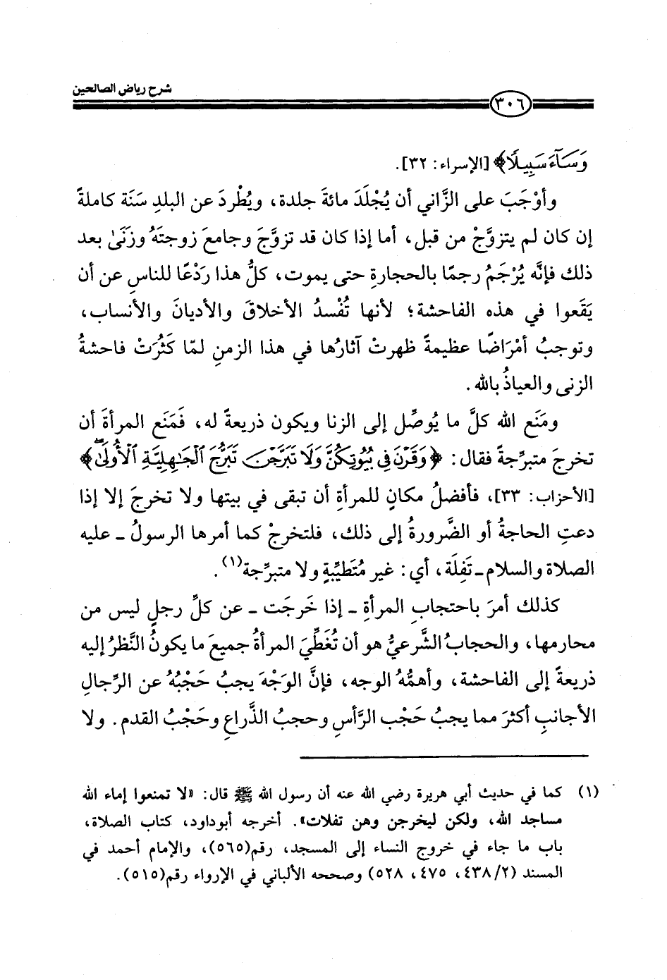 ومنع الله كل ما يوصل إلى الزنا ويكون ذريعة له، فمنع المرأة أن تخرج متبرجة فقال: (وَقَرْنَ فِي بُيُوتِكُنَّ وَلا تَبَرَّجْنَ تَبَرُّجَ الْجَاهِلِيَّةِ الْأُولَى) (الأحزاب: 33) ، فأفضل مكان للمرأة أن تبقي في بيتها ولا تخرج إلا إذا دعت الحاجة أو الضرورة إلى ذلك، فلتخرج كما أمرها الرسول ـ عليه الصلاة والسلام ـ تفلة، أي: غير متطيبة ولا متبرجة.