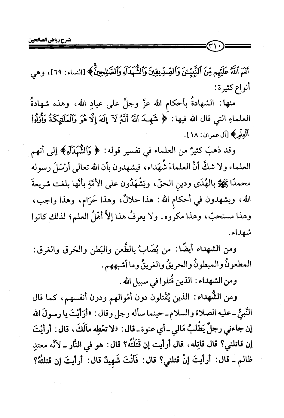 ومن الشهداء: الذين يقتلون دون أموالهم ودون أنفسهم، كما قال النبي ـ عليه الصلاة والسلام ـ حينما سأله رجل وقال: ((أرأيت يا رسول الله إن جاءني رجل يطلب مالي ـ أي عنوة ـ قال: ((لا تعطيه مالك، قال: أرأيت إن قاتلني؟ قال قاتله، قال أرأيت إن قتلته؟ قال: هو في النار ـ لأنه معتد ظالم ـ قال: أرأيت إن قتلني؟ قال: فأنت شهيد قال: أرأيت إن قتلته؟
