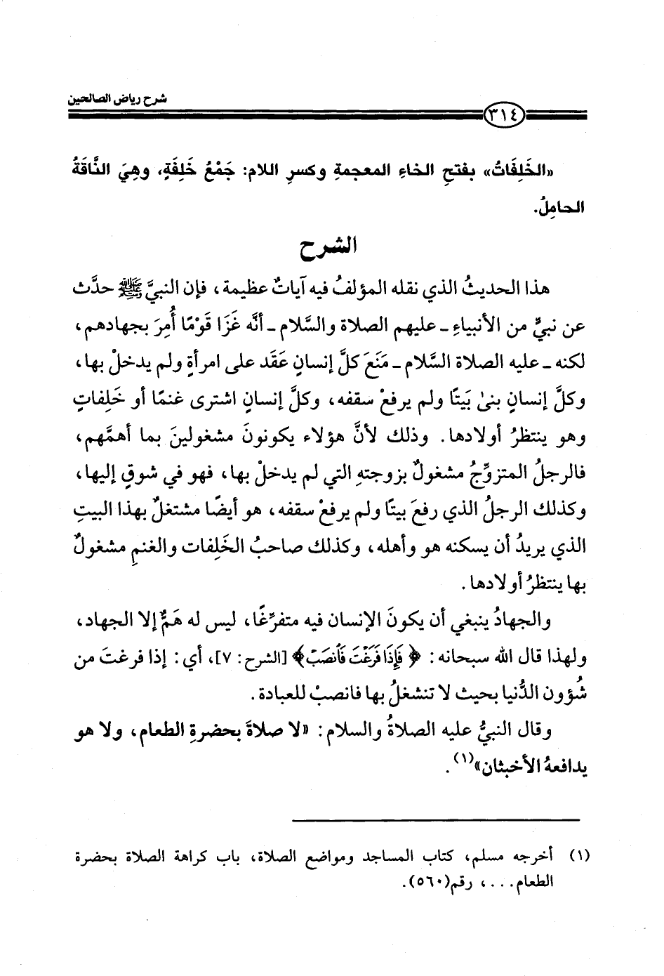 EXهذا الحديث الذي نقله المؤلف فيه آيات عظيمة، فإن النبي صلي الله عليه وسلم حدث عن نبي من الأنبياء ـ عليهم الصلاة والسلام ـ أنه غزا قوما أمر بجهادهم، لكنه ـ عليه الصلاة والسلام ـ منع كل إنسان عقد على امرأة ولم يدخل بها، وكل إنسان بنى بيتا ولم يرفع سقفه، وكل إنسان اشترى غنما أو خلفات وهو ينتظر أولادها. وذلك لأن هؤلاء يكونون مشغولين بما أهمهم، فالرجل المتزوج مشغول بزوجته التي لم يدخل بها، فهو في شوق إليها، وكذلك الرجل الذي رفع بيتاً ولم يسقفه، هو ايضاً مشتغل بهذا البيت الذي يريد ان يسكنه هو وأهله، وكذلك صاحب الخلفات والغنم مشغول بها ينتظر أولادها.