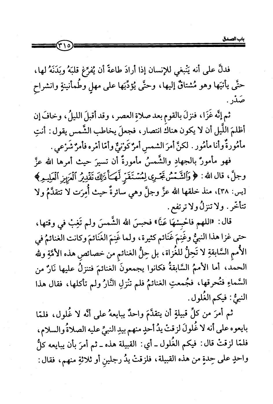ثم إنه غزا، فنزل بالقوم بعد صلاة العصر، وقد أقبل الليل، وخاف إن أظلم الليل أن لا يكون هناك انتصار، فجعل يخاطب الشمس يقول: أنت مأمورة وأنا مأمور. لكن أمر الشمس أمر كوني وأما أمره فأمر شرعي.