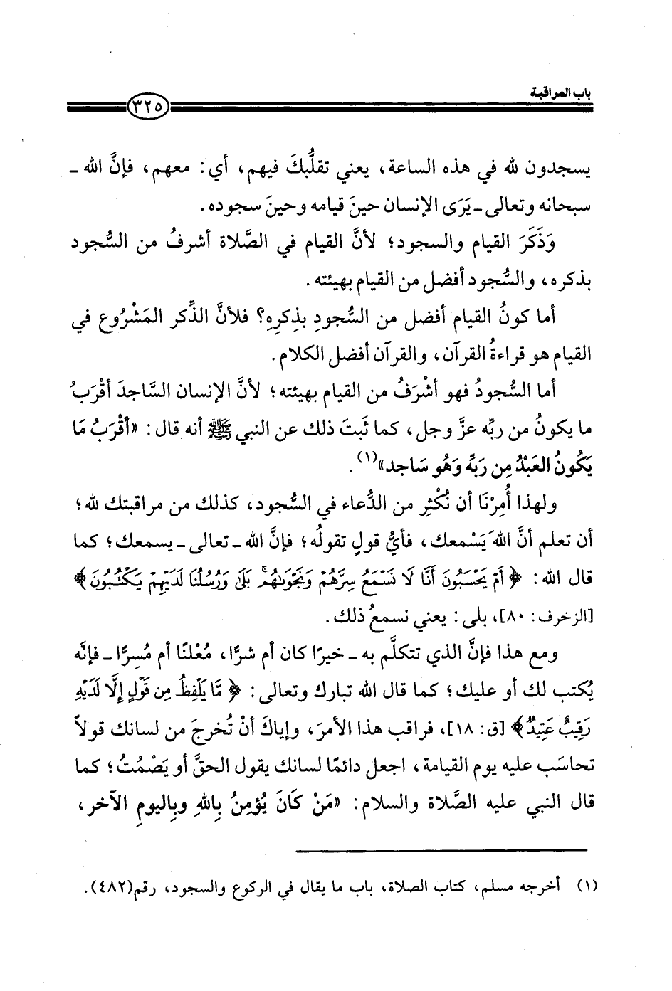 ولهذا أمرنا أن نكثر من الدعاء في السجود، كذلك من مراقبتك لله، أتعلم أن الله يسمعك، فأي قول تقوله؛ فإن الله تعالي يسمعك؛ كما قال الله:) أَمْ يَحْسَبُونَ أَنَّا لا نَسْمَعُ سِرَّهُمْ وَنَجْوَاهُمْ بَلَى وَرُسُلُنَا لَدَيْهِمْ يَكْتُبُونَ) (الزخرف: 80) ، بلي: يعني نسمع ذلك.