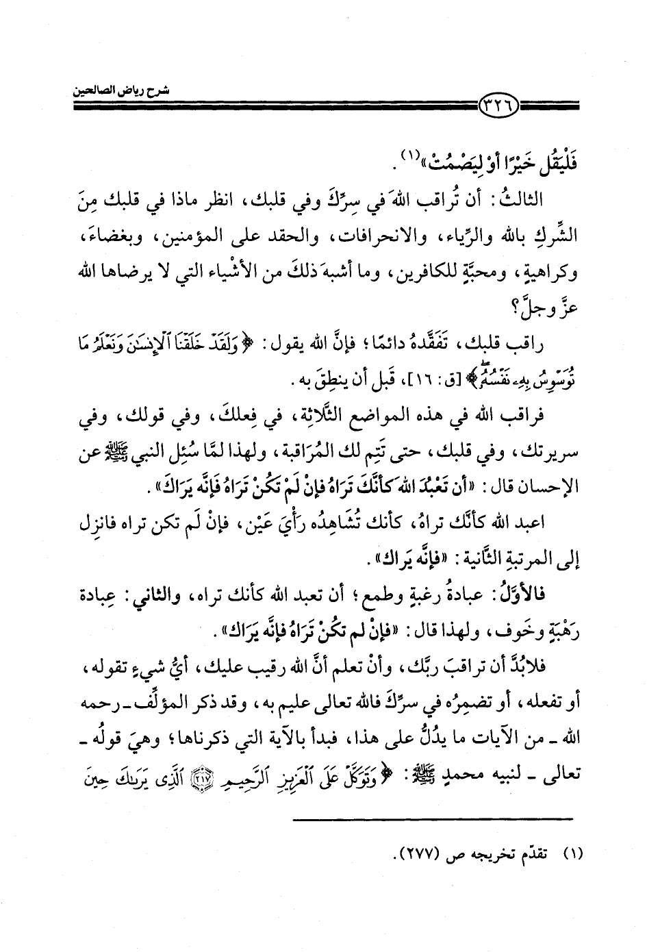 فراقب الله في هذه المواضع الثلاثة، في فعلك، وفي قولك، وفي سريرتك، وفي قلبك، حتى تتم لك المراقبة، ولهذا لما سئل النبي صلي الله عليه وسلم عن الإحسان قال: ((أن تعبد الله كأنك تراه فإن لم تكن تراه فإنه يراك)) .