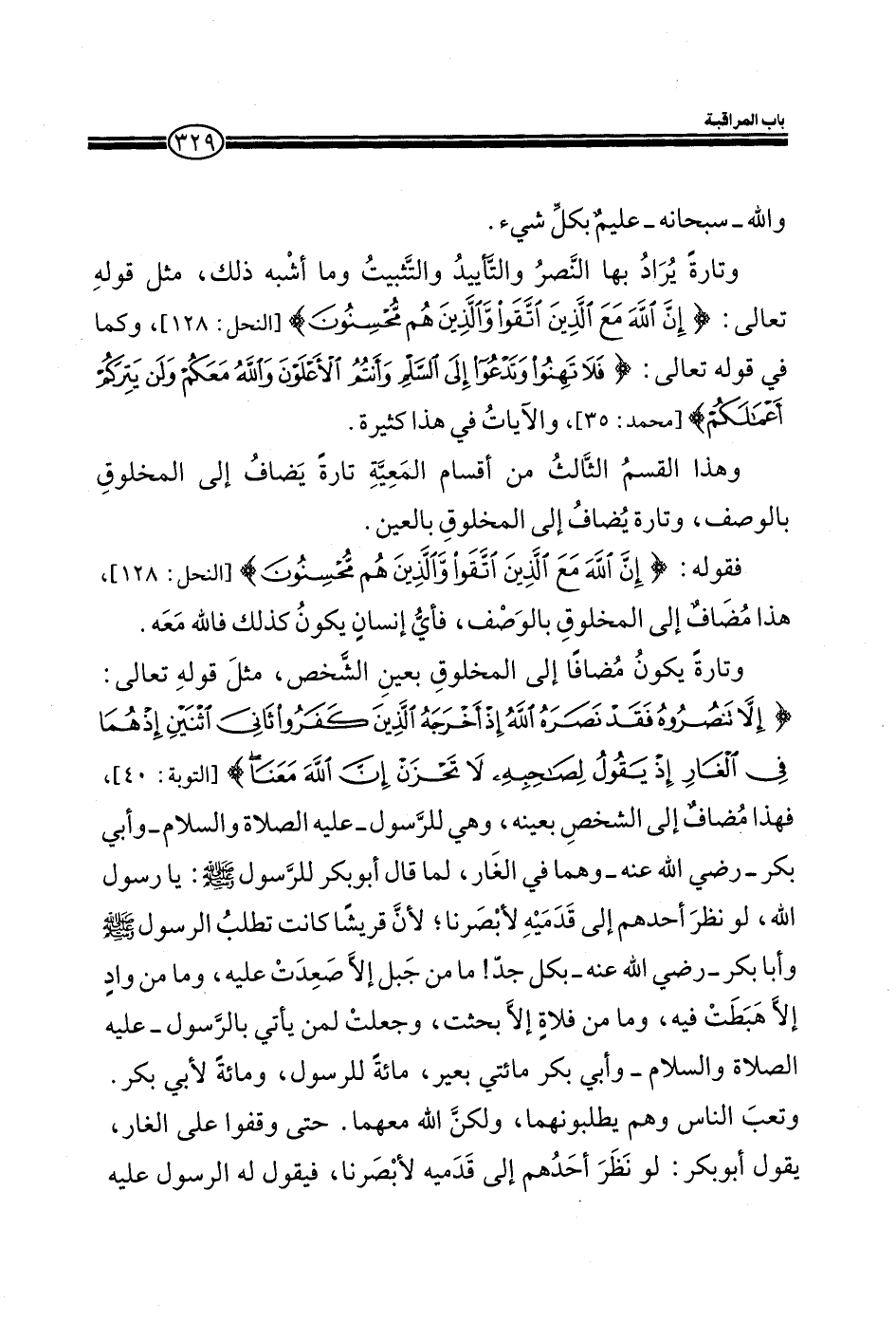 وتارة يكون مضافاً إلي المخلوق بعين الشخص، مثل قوله تعالي: (إِلاّ تَنْصُرُوهُ فَقَدْ نَصَرَهُ اللَّهُ إِذْ أَخْرَجَهُ الَّذِينَ كَفَرُوا ثَانِيَ اثْنَيْنِ إِذْ هُمَا فِي الْغَارِ إِذْ يَقُولُ لِصَاحِبِهِ لا تَحْزَنْ إِنَّ اللَّهَ مَعَنَا) (التوبة: من الآية40) ، فهذا مضاف إلي الشخص بعينه، وهي للرسول - عليه الصلاة والسلام- وأبي بكر - رضي الله عنه- وهما في الغار، لما قال أبو بكر للرسول النبي صلي الله عليه وعلي آله وسلم: يا رسول الله، لو نظر أحدهم إلي قدميه لأبصرنا، لأن قريشاً كانت تطلب الرسول النبي صلي الله عليه وعلي آله وسلم وابا بكر- رضي الله عنه- بكل جد! ما من جبل إلا صعدت عليه، وما من واد إلا هبطت فيه، وما من فلاة إلا بحثت، وجعلت لمن يأتي بالرسول- عليه الصلاة والسلام- وأبي بكر مائتي بعير، مائة للرسول، ومائة لأبي بكر، وتعب الناس وهم يطلبونها، ولكن الله معها. حتى وقفوا على الغار، يقول ابو بكر: لو نظر أحدهم إلي قدميه لأبصرنا، فيقول له الرسول عليه