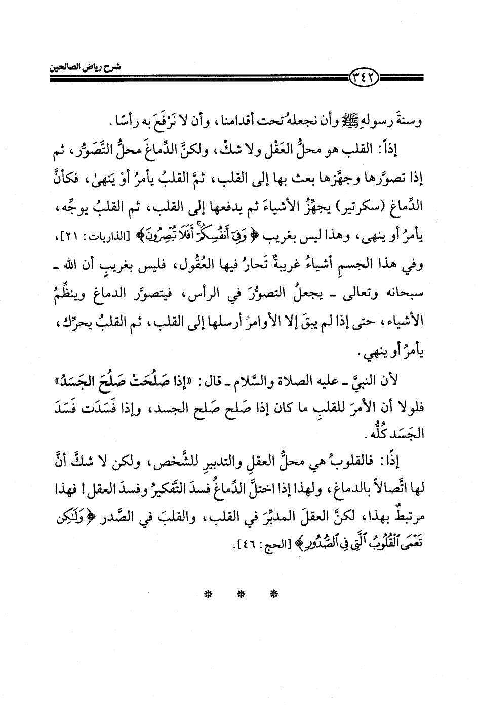 إذا: القلب هو محل العقل ولاشك، ولكن الدماغ محل التصور، ثم إذا تصورها وجهزها بعث بها إلي القلب، ثم القلب يأمر أو ينهي النبي صلي الله عليه وسلم فكأن الدماغ (سكرتير) يجهز الأشياء ثم يدفعها إلي القلب، ثم القلب يوجه، يأمر أو ينهي، وهذا ليس بغريب) وَفِي أَنْفُسِكُمْ أَفَلا تُبْصِرُونَ) (الذريات: 21) ، وفي هذا الجسم أشياء غريبة تحار فيها العقول، فليس بغريب أن الله- سبحانه وتعالي- يجعل التصور في الرأس، فيتصور الدماغ وينظم الأشياء، حتى إذا لم يبق إلا الأوامر أرسلها إلي القلب، ثم القلب يحرك، يأمر أو ينهي.