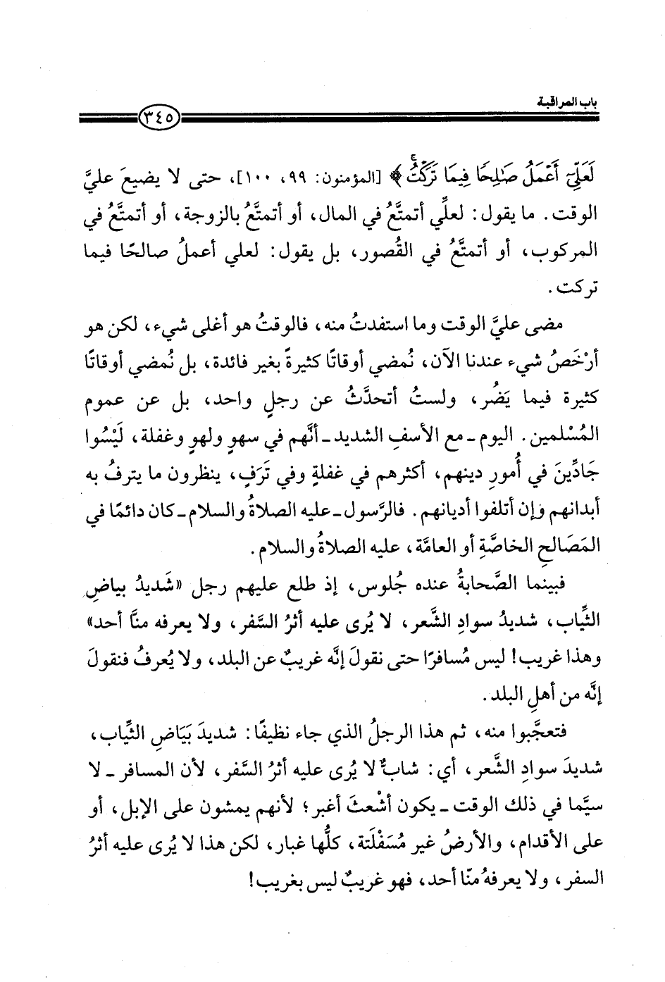 (لَعَلِّي أَعْمَلُ صَالِحاً فِيمَا تَرَكْتُ) (المؤمنون: 99، 100) ، حتى لا يضيع على الوقت. ما يقول: لعلي أتمتع في المال، أو أتمتع بالزوجة، أو أتمتع في المركوب، أو أتمتع في القصور، بل يقول: لعلي اعمل صالحا فيما تركت.