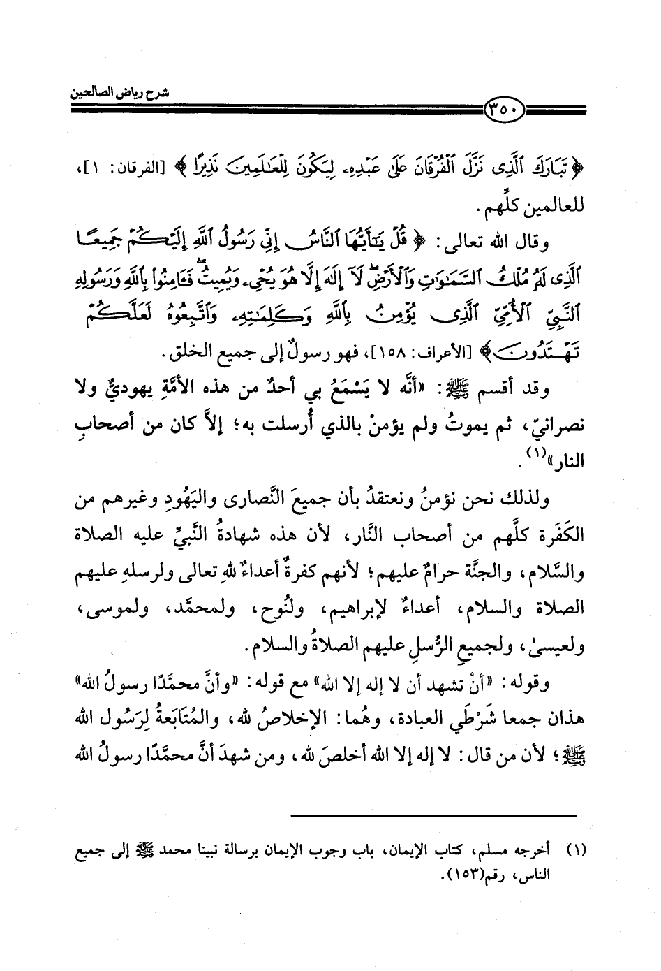وقد أقسم صلي الله عليه وسلم: ((أنه لا يسمع بي أحد من هذه الأمة يهودي ولا نصراني ثم يموت ولم يؤمن بالذي أرسلت به؛ إلا كان من أصحاب النار)) .