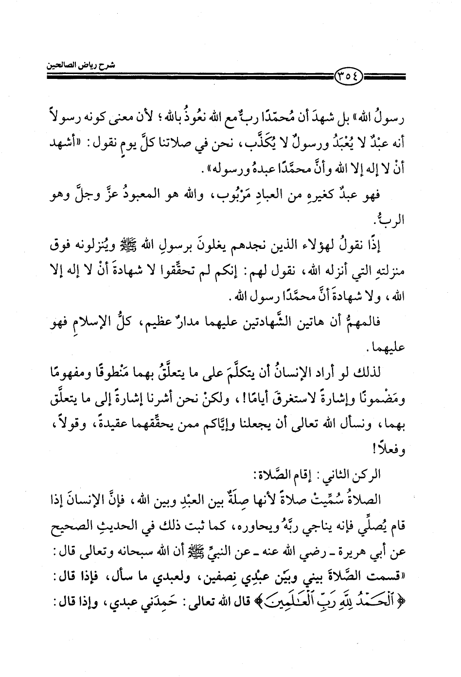 الركن الثاني: أقام الصلاة: الصلاة سميت صلاة لأنها صلة بين العبد وبين الله، فان الإنسان إذا قام يصلي فانه يناجي ربه ويحاوره، كما ثبت ذلك في الحديث الصحيح عن أبي هريرة_ رضي الله عنه _ عن النبي صلي الله عليه وسلم أن الله سبحانه وتعالى قال: ((قسمت الصلاة بيني وبين عبدي نصفين، ولعبدي ما سال، فإذا قال: ((الحمد لله رب العالمين) قال الله تعالى: حمدني عبدي، وإذا قال: