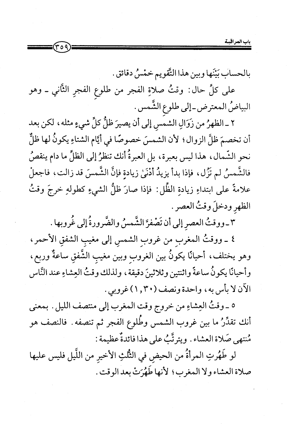 5_ وقت العشاء من خروج وقت المغرب إلى منتصف الليل. بمعني انك تقدر ما بين غروب الشمس وطلوع الفجر ثم تنصفه. فالنصف هو منتهى صلاة العشاء. ويترتب علي هذا فائدة عظيمة: لو طهرت المرأة من الحيض في الثلث الأخير من الليل فليس عليها صلاة العشاء ولا المغرب، لأنها طهرت بعد الوقت.