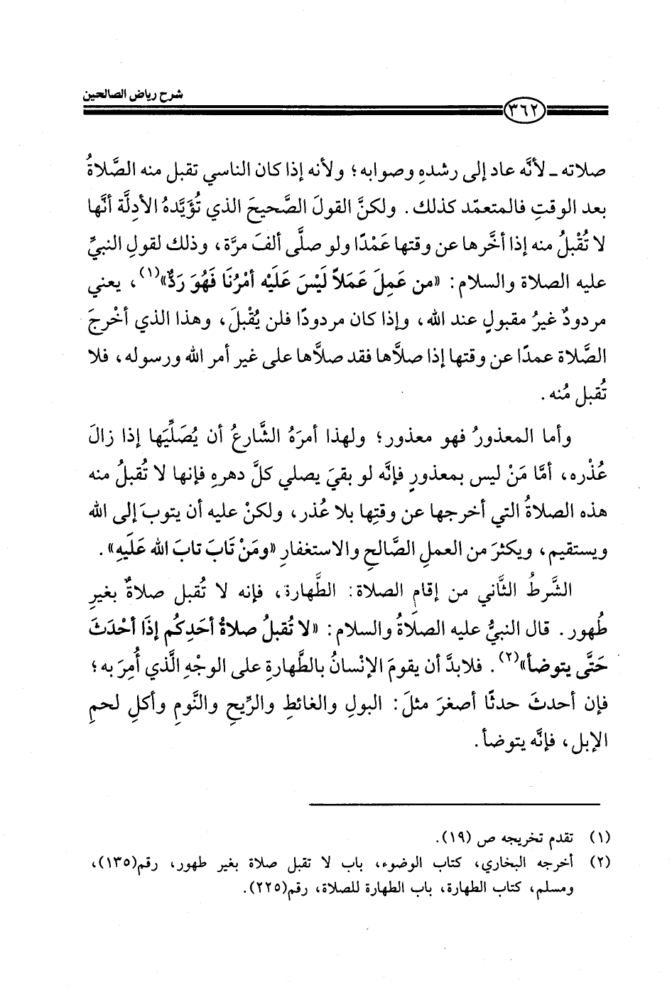 صلاته_ لأنه عاد إلى رشده وصوابه ولانه إذا كان الناسي تقبل منه الصلاة بعد الوقت فالمتعمد كذلك. ولكن القول الصحيح الذي تؤيده الأدلة إنها لا تقبل منه إذا آخرها عن وقتها عمدا ولو صلي ألف مرة، وذلك لقول النبي عليه الصلاة والسلام: ((من عمل عملا ليس عليه امرنا فهو رد)) ، يعني مردود غير مقبول عند الله، وإذا كان مردودا فلن يقبل، وهذا الذي اخرج الصلاة عمدا عن وقتها إذا صلاها فقد صلاها علي غير أمر الله ورسوله، فلا تقبل منه. واما المعذور فهو معذور، ولهذا أمره الشارع أن يصليها إذا ذال عذره، إما من ليس بمعذور فانه لو بقي يصلي كل دهره فإنها ل اتقبل منه هذه الصلاة التي أخرجها عن وقتها بلا عذر، ولكن عليه أن يتوب إلى الله ويستقيم، ويكثر من العمل الصالح والاستغفار ((ومن تاب