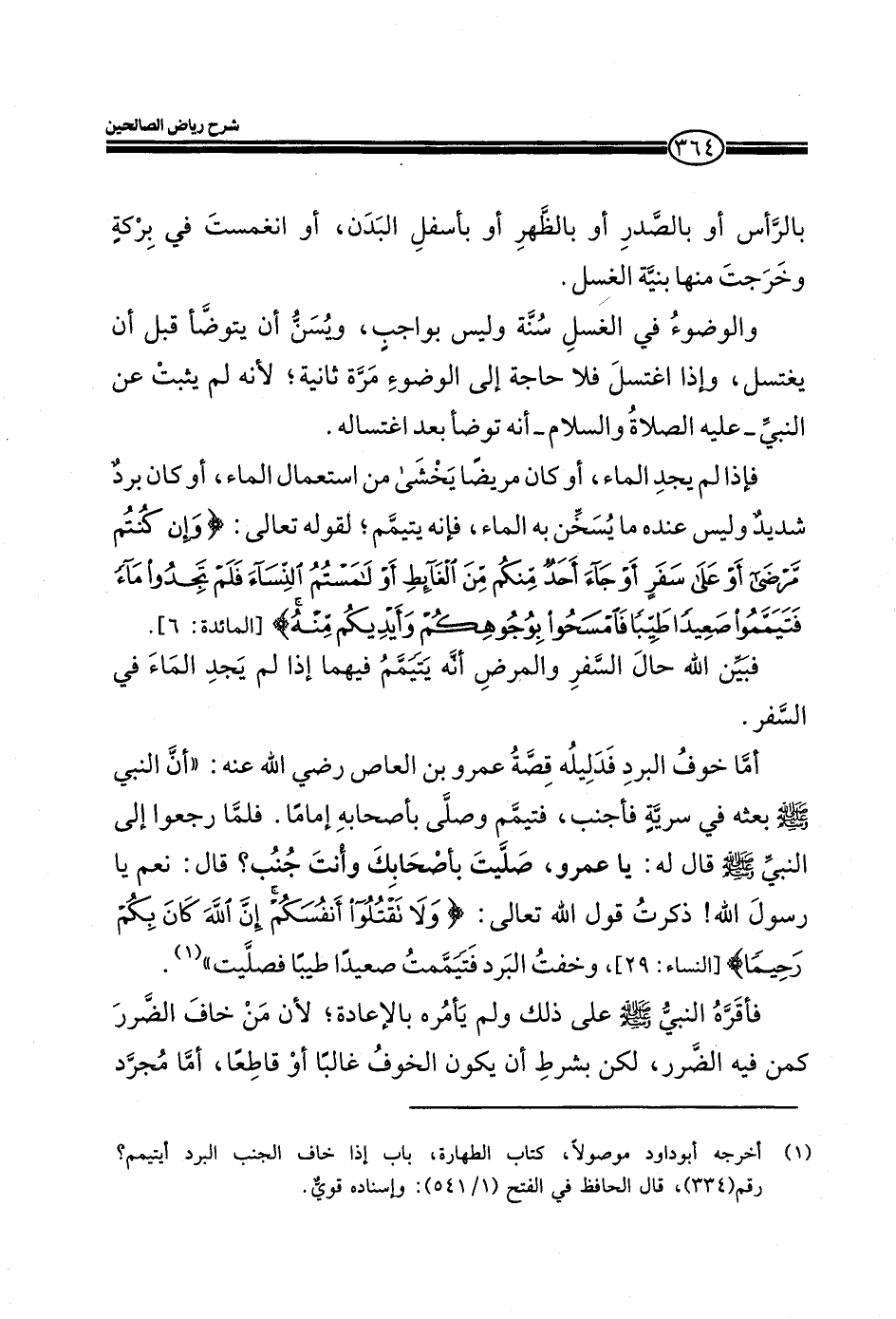 وَأَيْدِيكُمْ مِنْهُ مَا يُرِيدُ اللَّهُ لِيَجْعَلَ عَلَيْكُمْ مِنْ حَرَجٍ وَلَكِنْ يُرِيدُ لِيُطَهِّرَكُمْ وَلِيُتِمَّ نِعْمَتَهُ عَلَيْكُمْ لَعَلَّكُمْ تَشْكُرُونَ) (المائدة: 6) فبين الله حال السفر والمرض انه يتيمم فيهما إذا لم يجد الماء في السفر. إما خوف البرد فدليله قصة عمرو بن العاص رضي الله عنه: ((أن النبي صلي الله عليه وسلم أرسله في سرية فأجنب، فتيمم وصلي بأصحابه إماما. فلما رجعوا إلى النبي صلي الله عليه وسلم قال له: يا عمرو، صليت بأصحابك وأنت جنب؟ قال: نعم يا رسول الله! ذكرت قول الله تعالى: (وَلا تَقْتُلُوا أَنْفُسَكُمْ إِنَّ اللَّهَ كَانَ بِكُمْ رَحِيماً) (النساء: من الآية29) فخفت البرد فتيممت صعيدا طيبا فصليت)) . فاقره النبي صلي الله علي وسلم علي ذلك ولم يأمره بالإعادة، لان من خاف الضرر كمن فيه الضرر، لكن بشرط أن يكون الخوف غالبا أو قاطعا، إما مجرد