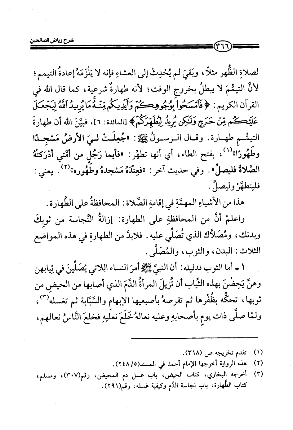 اللَّهُ لِيَجْعَلَ عَلَيْكُمْ مِنْ حَرَجٍ وَلَكِنْ يُرِيدُ لِيُطَهِّرَكُمْ ْ) (المائدة: من الآية6) فبين الله أن طهارة التيمم طهارة. وقال الرسول صلي الله عليه وسلم: ((جعلت لي الأرض مسجدا وطهورا)) بفتح الطاء، أي أنها تطهر: ((فأيما رجل من أمتي أدركته الصلاة فليصل)) . وفي حديث آخر: ((فعنده مسجده وطهوره)) . يعني: فليتطهر وليصل هذا من الأشياء المهمة في إقامة الصلاة: المحافظة علي الطهارة. واعلم أن من المحافظة علي الطهارة: إزالة النجاسة من ثوبك وبدنك، ومصلاك الذي تصلي عليه. فلابد م الطهارة في هذه المواضع الثلاث: البدن، والثوب، والمصلي.