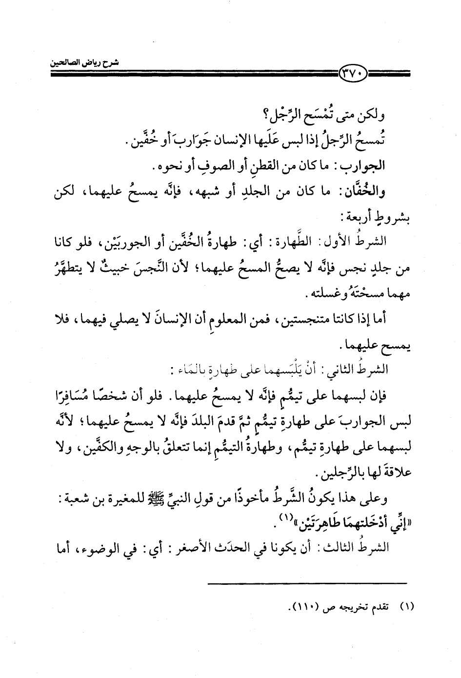 الشرط الأول: الطهارة: أي طهارة الخفين أو الجوربين، فلو كانا من جلد نجس فانه لا يصح المسح عليهما، لان النجس خبيث لا يتطهر مهما مسحته وغسلته. أما إذا كانتا متنجستين، فمن المعلوم أن الإنسان لا يصلي فيهما، فلا يمسح عليهما.