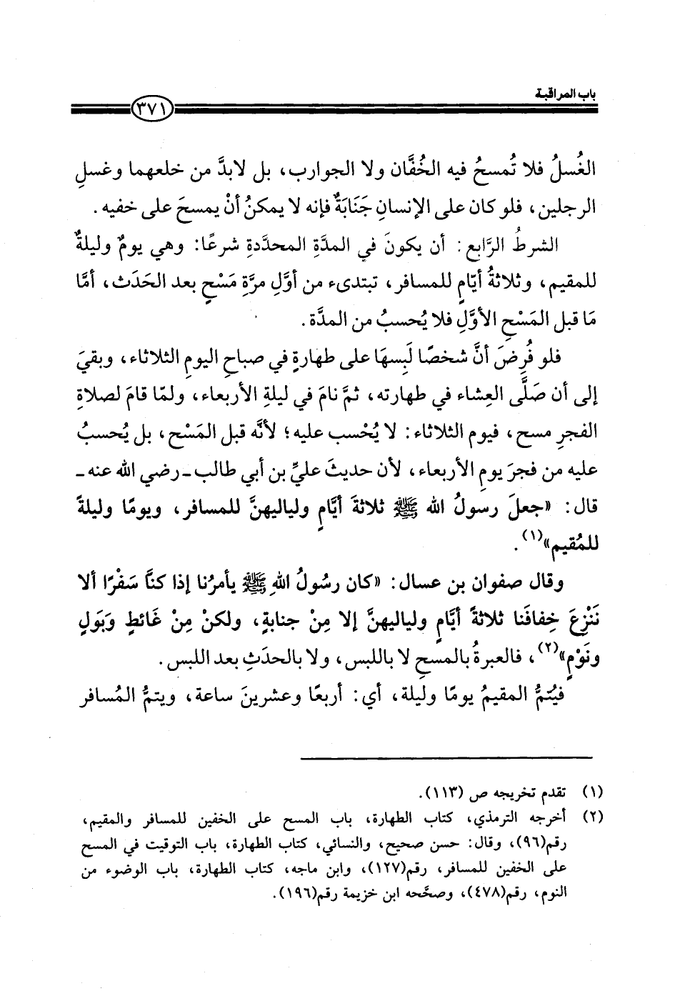 وقال صفوان بن عسال: ((كان رسول الله صلي الله عليه وسلم يأمرنا إذا كنا سفرا إلا ننزع خناقنا ثلاث أيام ولياليهن إلا من جنابة، ولكن من غائط وبول ونوم)) (،) فالعبرة بالمسح لا باللبس، ولا بالحدث بعد اللبس. فيتم المقيم يوم وليلة، أي: أربعا وعشرين ساعة، ويتم المسافر