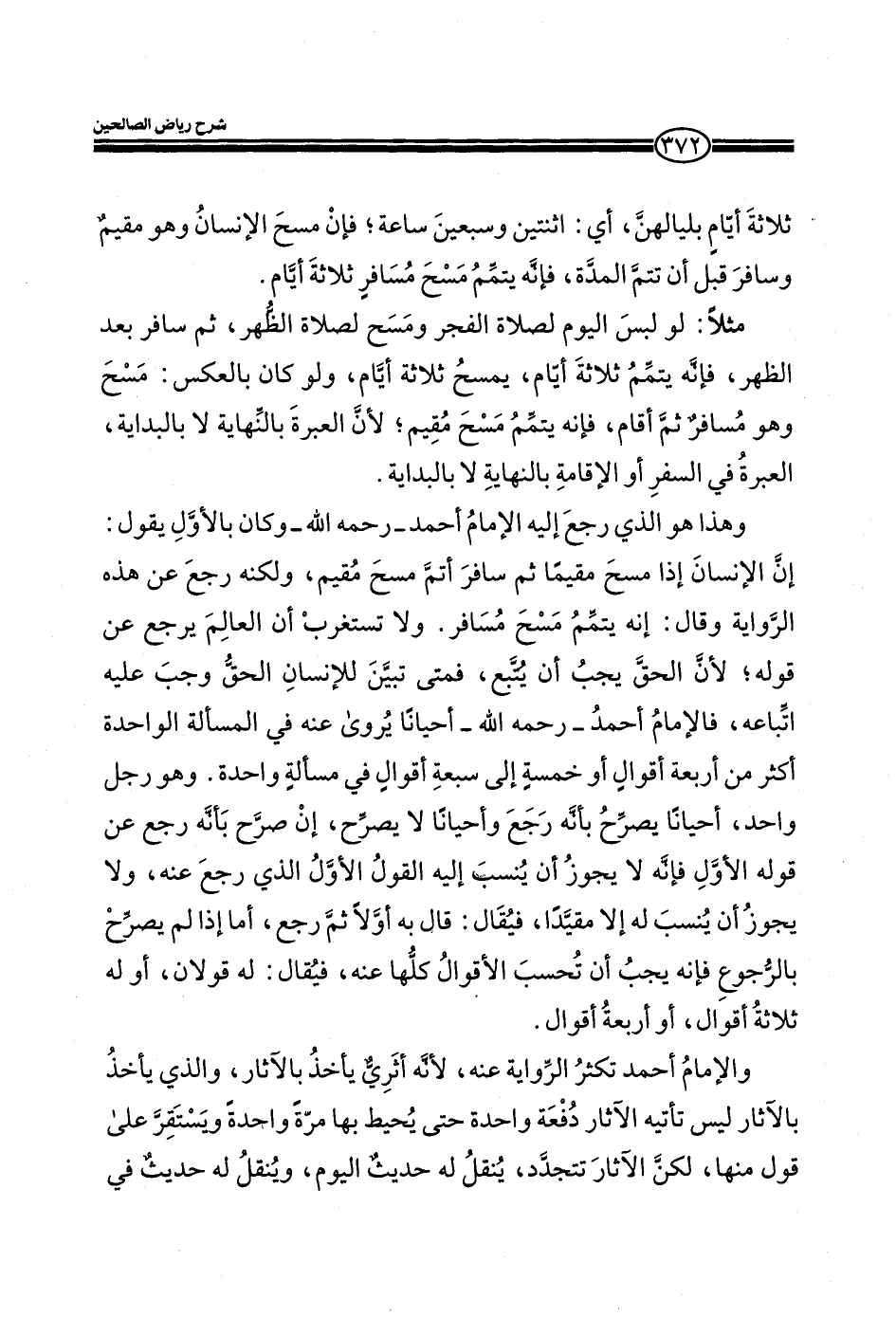 ولو كان بالعكس: مسح وهو مسافر ثم أقام، فانه يتمم مسح مقيم، لان العبرة بالنهاية لا بالبداية، العبرة في السفر أو الإقامة بالنهاية لا بالبداية. وهذا هو الذي رجع إليه الإمام احمد_ رحمه الله_ وكان بالأول يقول: أن الإنسان إذا مسح مقيما ثم سافر أتم مسح مقيم، لكنه رجع عن هذه لرواية وقال: لنه يتمم مسح مسافر. ولا تستغرب أن العالم يرجع عن قوله، لان الحق يجب أن يتبع، فمتي تبين للإنسان الحق وجب عليه اتباعه، فالإمام احمد_ رحمه الله_ أحيانا يروي عنه في المسالة الواحدة اكثر من أربعة أقوال أو خمسة إلى سبعة أقوال في مسالة واحدة. وهو رجل واحد، أحيانا يصرح بأنه رجع وأحيانا لا يصرح، أن صرح بأنه رجع عن قوله الأول فانه لا يجوز أن ينسب إليه القول الذي رجع عنه، ولا يجوز أن ينسب له الا مقيدا، فيقال: قالبه أولا ثم رجع، أما إذا لم يصرح بالجوع فانه يجب أن تسحب الأقوال كلها عنه، فيقال: له قولان، أو له ثلاث أقوال، أو أربعة أقوال. والإمام احمد تكثر الرواية عنه، لأنه اثري يأخذ بالآثار، والذي يأخذ بالآثار ليس تأتيه الآثار دفعة واحدة حتى يحيط بها مرة واحدة ويستقر علي قوله منها، لكن الآثار تتجدد، ينقل له حديث