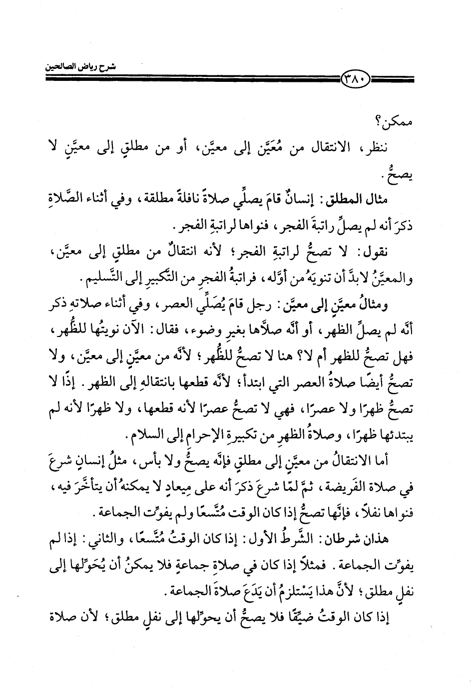 مثال المطلق: إنسان قام يصلي صلاة نافلة مطلقة، وفي أثناء الصلاة ذكر انه لم راتبة الفجر، فنواها لرابة الفجر. نقول: لا تصح لراتبة الفجر، لأنه انتقال من مطلق إلى معين، والمعين لابد أن تنويه من أوله، فراتبة الفجر من التكبير إلى التسليم. ومثال معين إلى معين: رجل قام يصلي العصر، وفي أثناء صلاته ذظر انه لم يصل الظهر، أو انه صلاها بغير وضوء، فقال: الآن نويتها للظهر، فهل تصح للظهر أم لا؟ هنا لا تصح للظهر، لانه من معين إلى معين، ولا تصح أيضا صلاة العصر التي أبتدأ، لأنه قطعها بانتقا له إلى الظهر. اذ لا تصح ظهرا ولا عصرا، فهي لا تصح عصرا لأنه قطعها، ولا ظهرا لأنه لم يبتدئها ظهرا، وصلاة الظهر من تكبيرة الإحرام إلى السلام. أما الانتقال من معين إلى مطلق فانه يصح ولا باس، مثل إنسان شرع في صلاة الفريضة، ثم لما شرع ذكر انه علي ميعاد لا يمكنه أن يتأخر فيه، فنواها نفلا، فإنها تصح إذا كان الوقت متسعا ولم يفوت الجماعة. هذان شرطان: الشرط الأول: إذا كان ألقت متسعا، والثاني: إذا لم يفوت الجماعة. فمثلا إذا كان في صلاة جماعة فلا يمكن أن يحولها إلى نفل مطلق، لان هذا يستلزم أن يدع صلاة الجماعة. إذا كان الوقت ضيقا